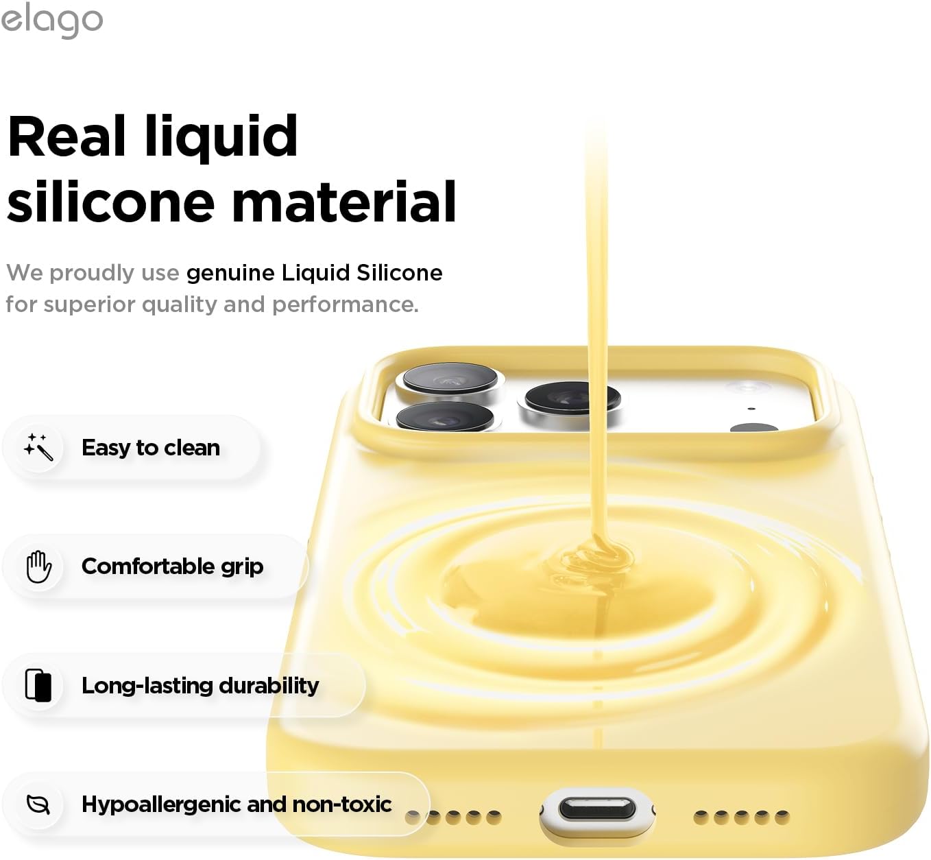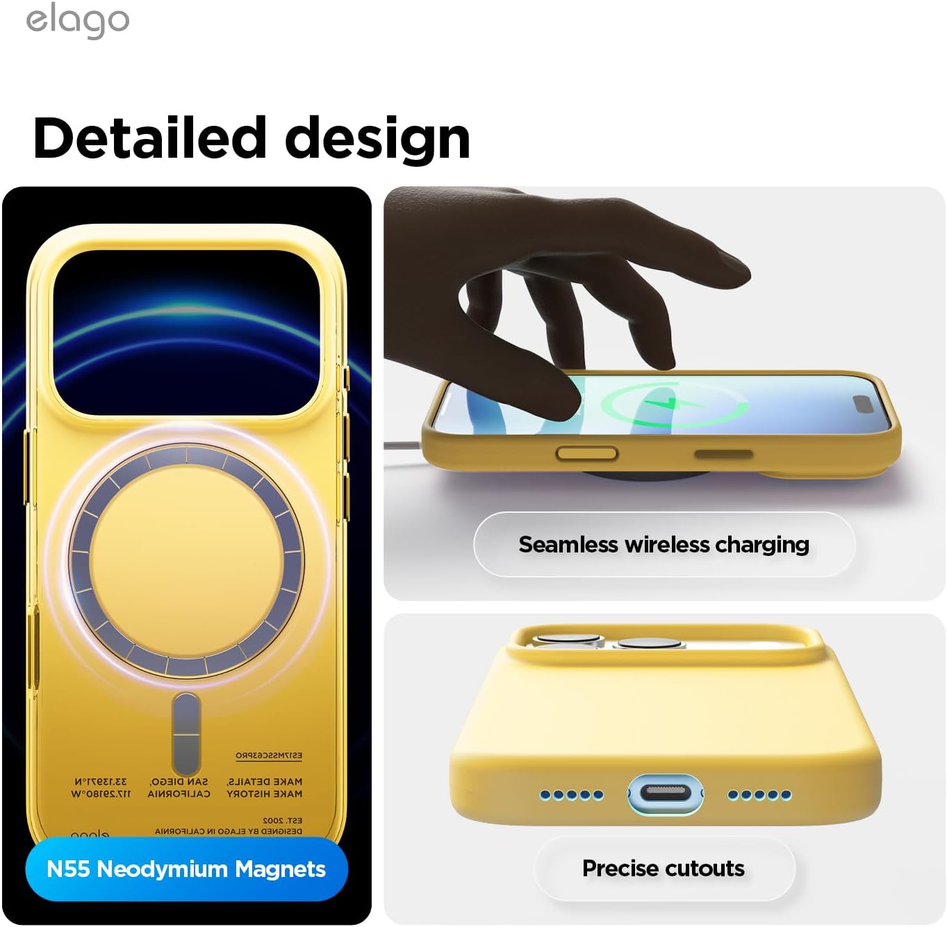 Силиконов калъф elago Magnet за iPhone 17 Pro, съвместим с MagSafe, първокласен течен силикон, удароустойчив, тънък защитен калъф (жълт)