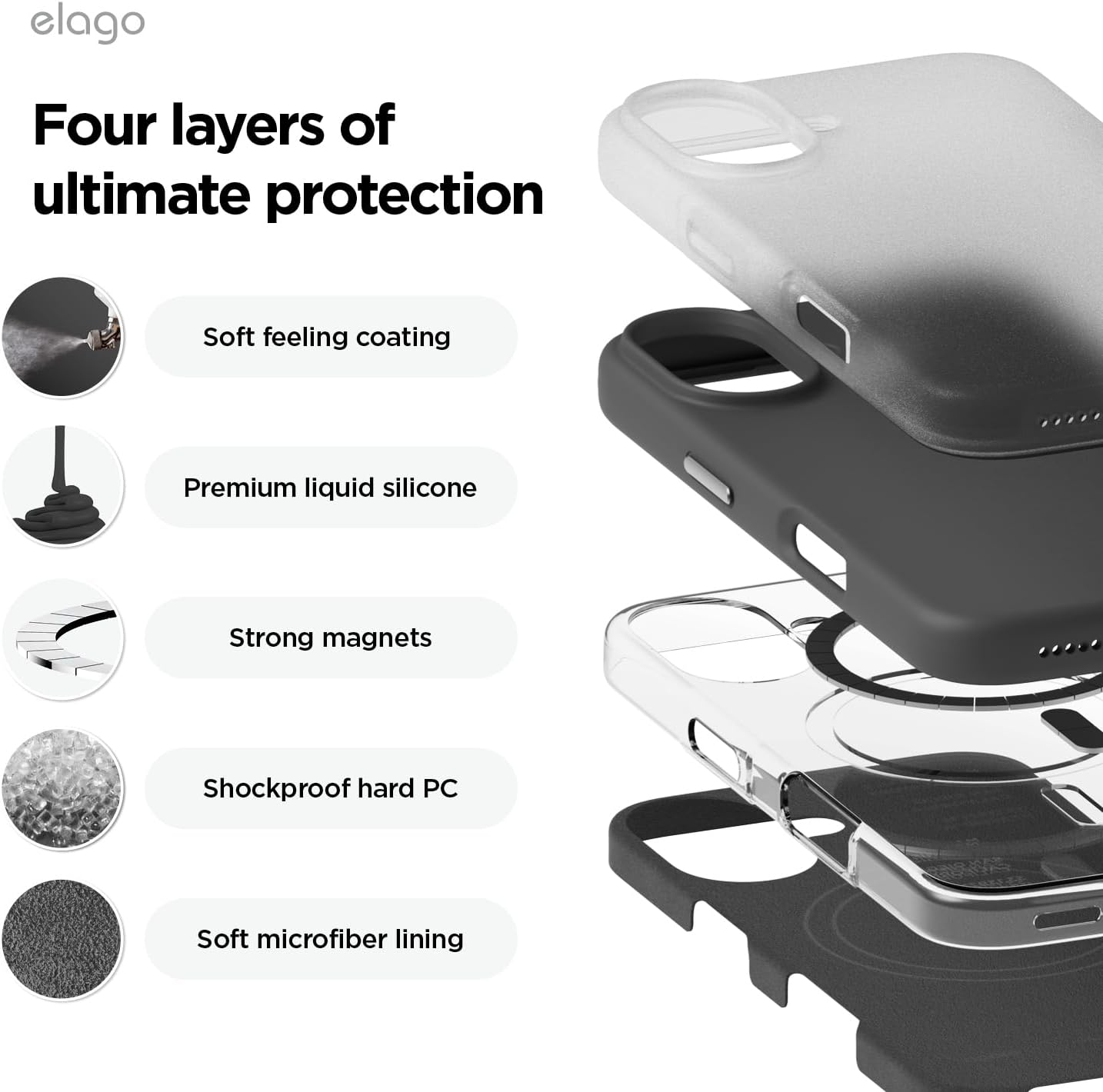 Силиконов калъф elago Magnetic, съвместим с iPhone 16 Plus 6.7 инча, съвместим с всички аксесоари MagSafe - вградени магнити, мек силиконов захват, удароустойчив (черен)
