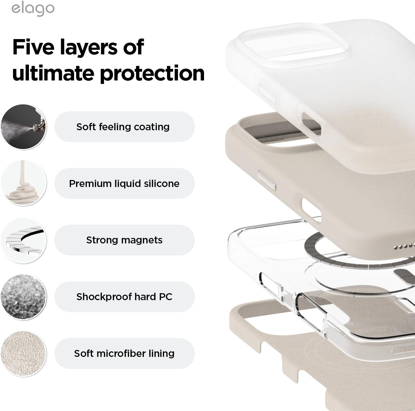 • Вътрешен дизайн за iPhone 17 Pro: това не е стандартен калъф. Дизайнерският екип на elagos проектира, тества и оптимизира всяка извивка за персонализирано прилягане, стилен външен вид и ежедневна защита от падане – всичко от един източник.