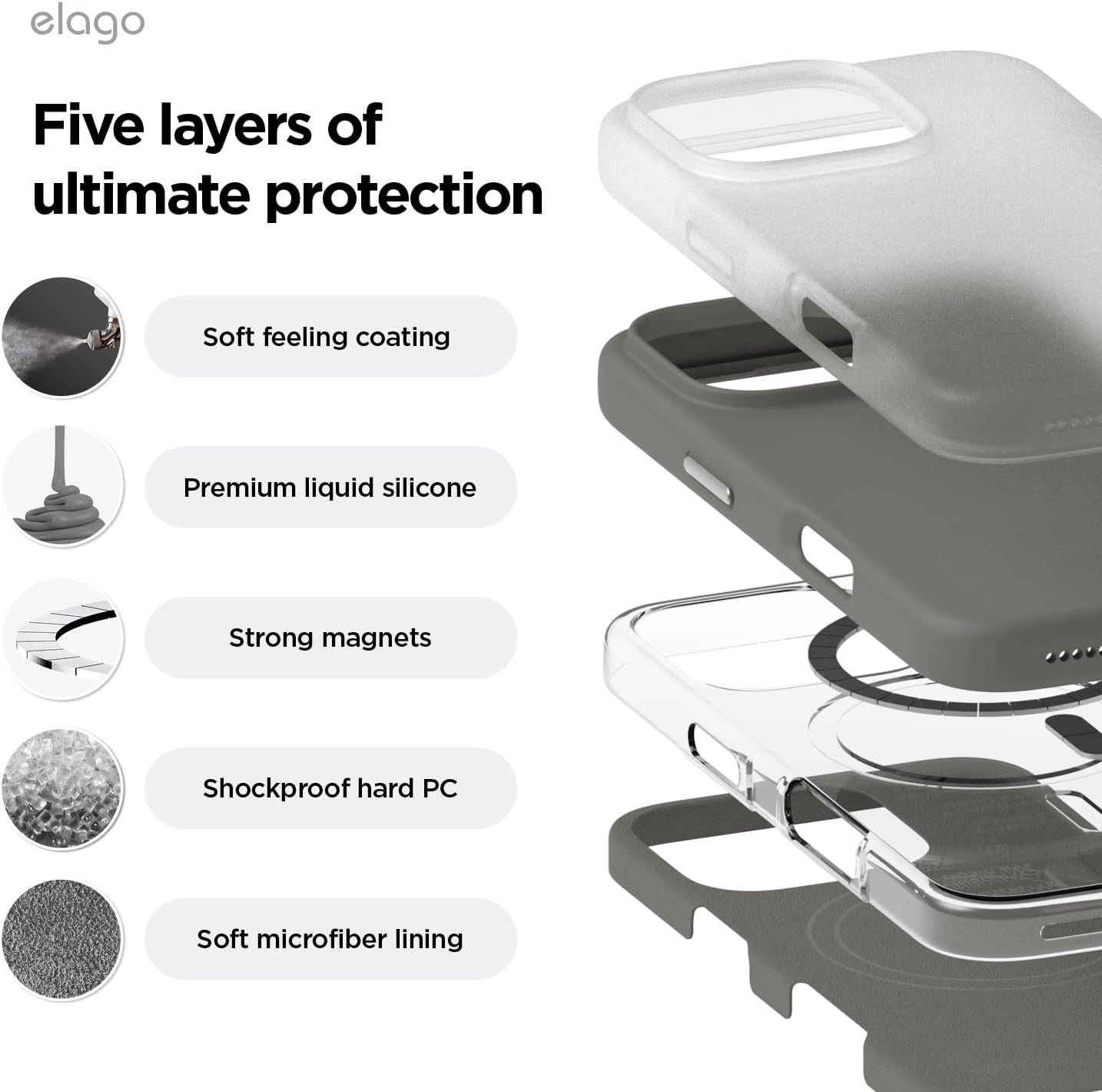 Силиконов калъф elago Magnetic, съвместим с iPhone 16 Pro 6.3 инча, съвместим с всички аксесоари MagSafe - вградени магнити, мек силиконов захват, удароустойчив (средно сив)