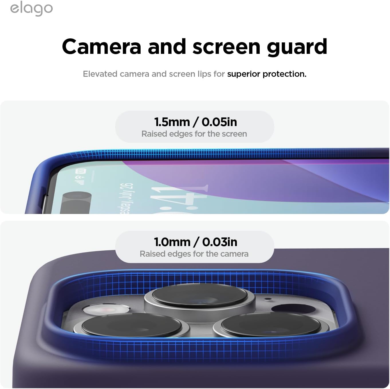 • Повдигнати ръбове за защита: дизайнът с пълно покритие на ръбовете защитава всички страни, портове и бутони; ръбовете около дисплея и камерата са повдигнати с 1 мм, за да предпазят от надраскване на повърхностите. Тънкият дизайн позволява безжично зареждане.