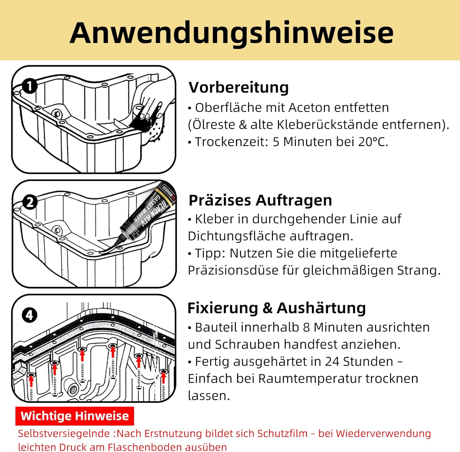 • 4. Приложение: силиконовият уплътнител е подходящ за всички често срещани приложения на уплътняване, включително автомобили, мотоциклети и селскостопанска техника. Използва се главно за уплътнения на двигатели, цилиндри, трансмисии, предни и задни мостове, помпи, компресори, картери и термостати.