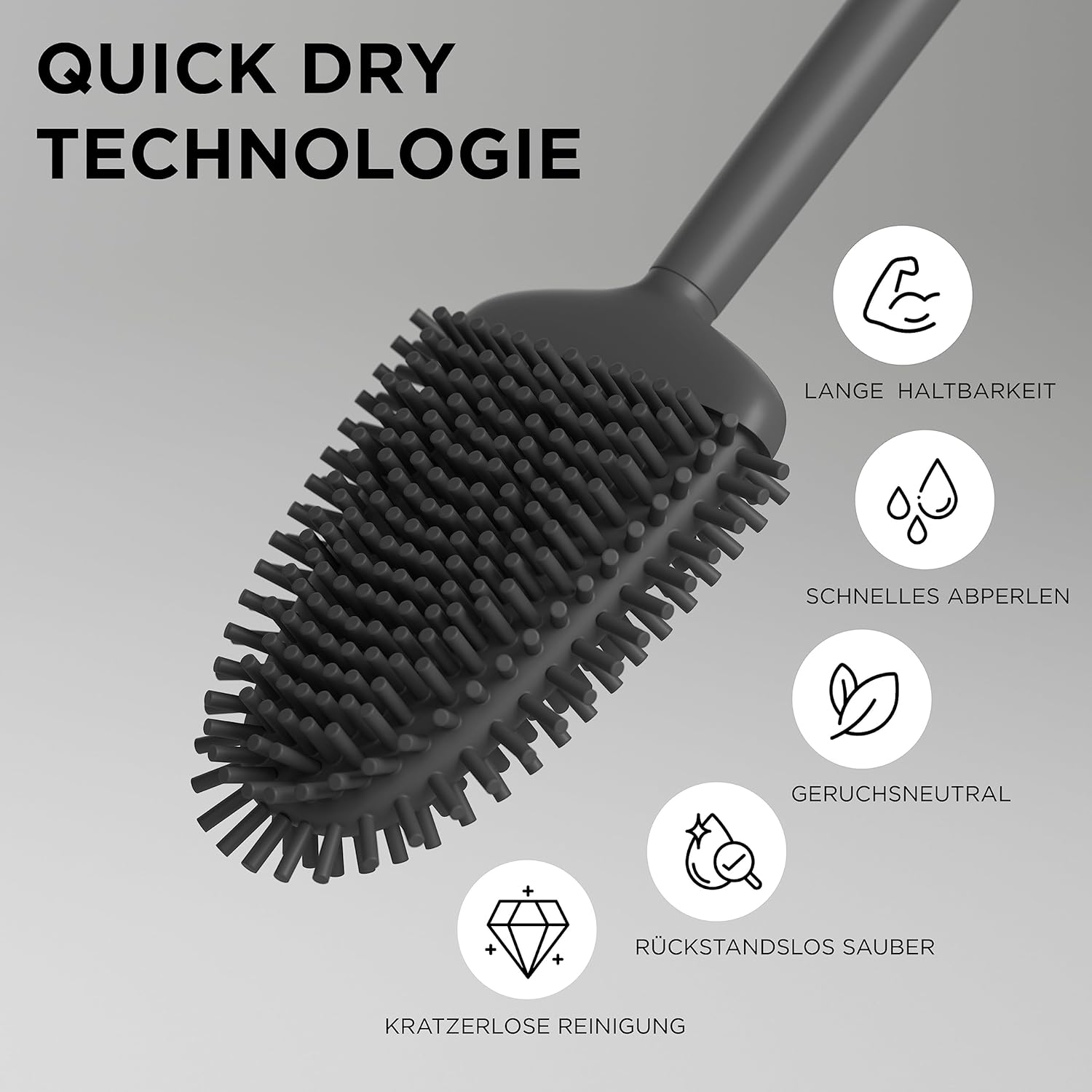 Силиконова четка за тоалетна с плоска и гъвкава глава - Силиконова четка за тоалетна с бързосъхнещ държач - Модерна четка за тоалетна за стенен монтаж без пробиване (Резервна сива)