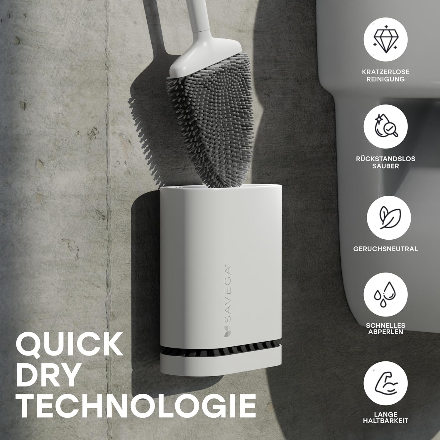 • Цялостно дълбоко почистване - Тоалетната четка SAVEGA постига дълбоко почистване от канала до под ръба с гъвкавите си влакна. Гарантираме перфектни резултати от почистването.