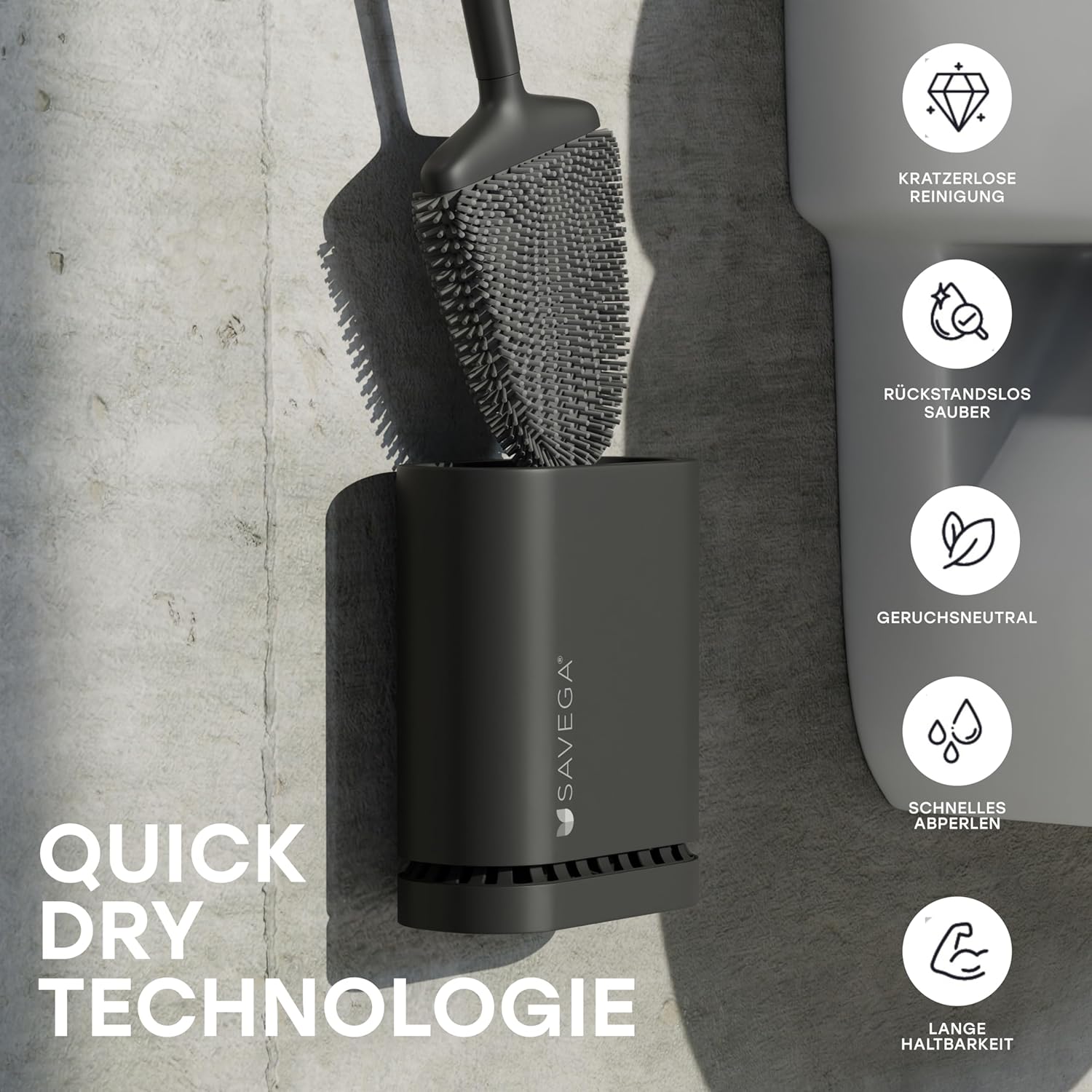 • Цялостно дълбоко почистване - Тоалетната четка SAVEGA постига дълбоко почистване от канала до под ръба с гъвкавите си влакна. Гарантираме перфектни резултати от почистването.