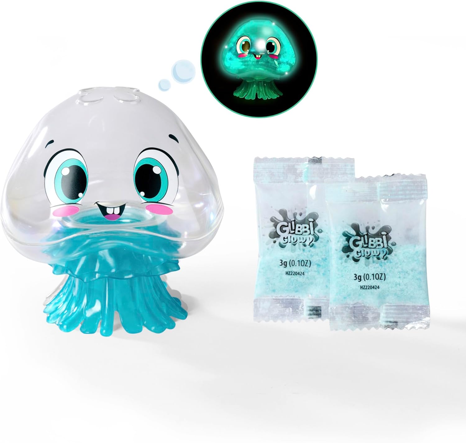 • Когато слузта за игра се държи под лампа за около 10 минути, тя свети в тъмното - какво забавление; Когато времето за игра приключи, слузта Glibbi може практически да се съхранява в медузата.
