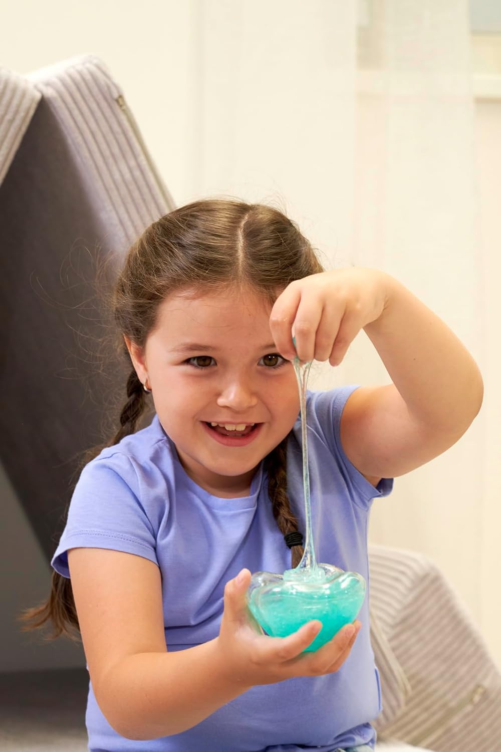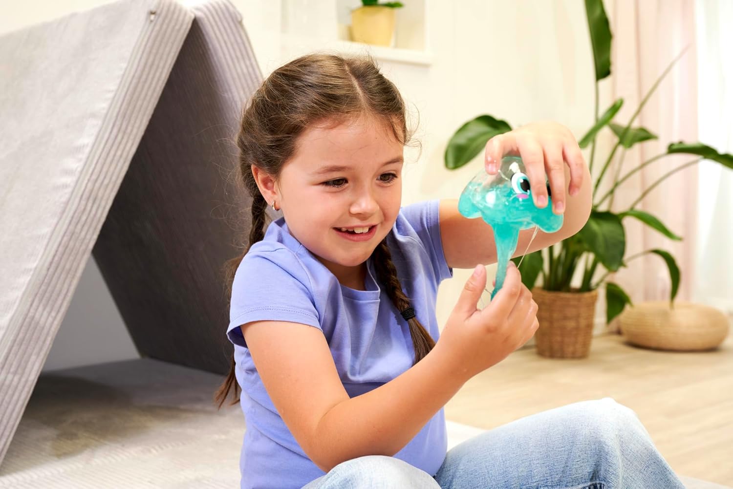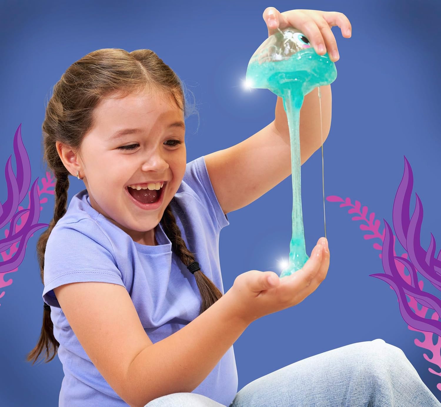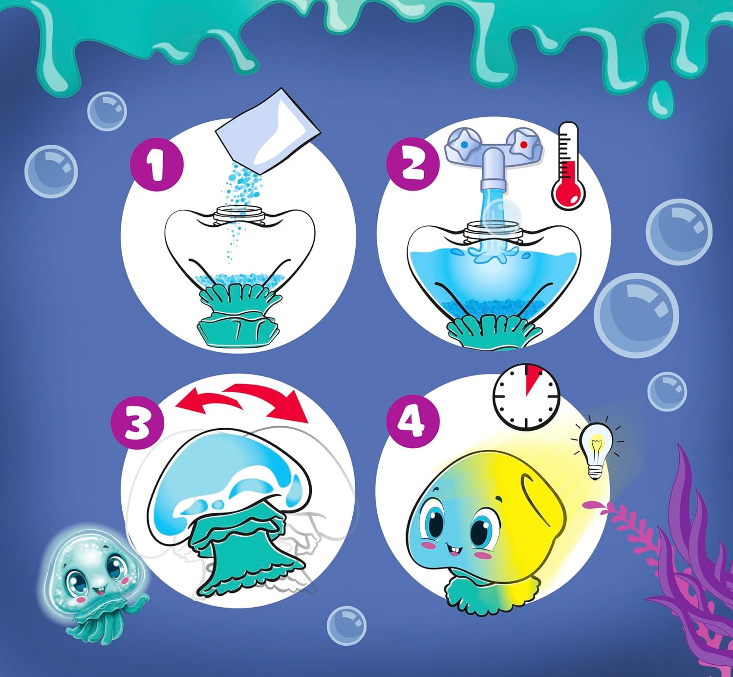 • Ако медузата се напълни с прах Glibbi Glowy и хладка вода и се разклати добре, се получава тюркоазена слуз, с която можете да си играете до насита.