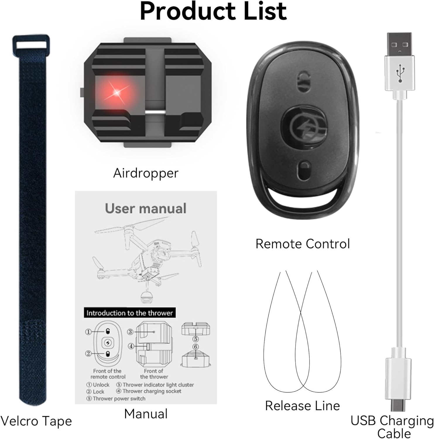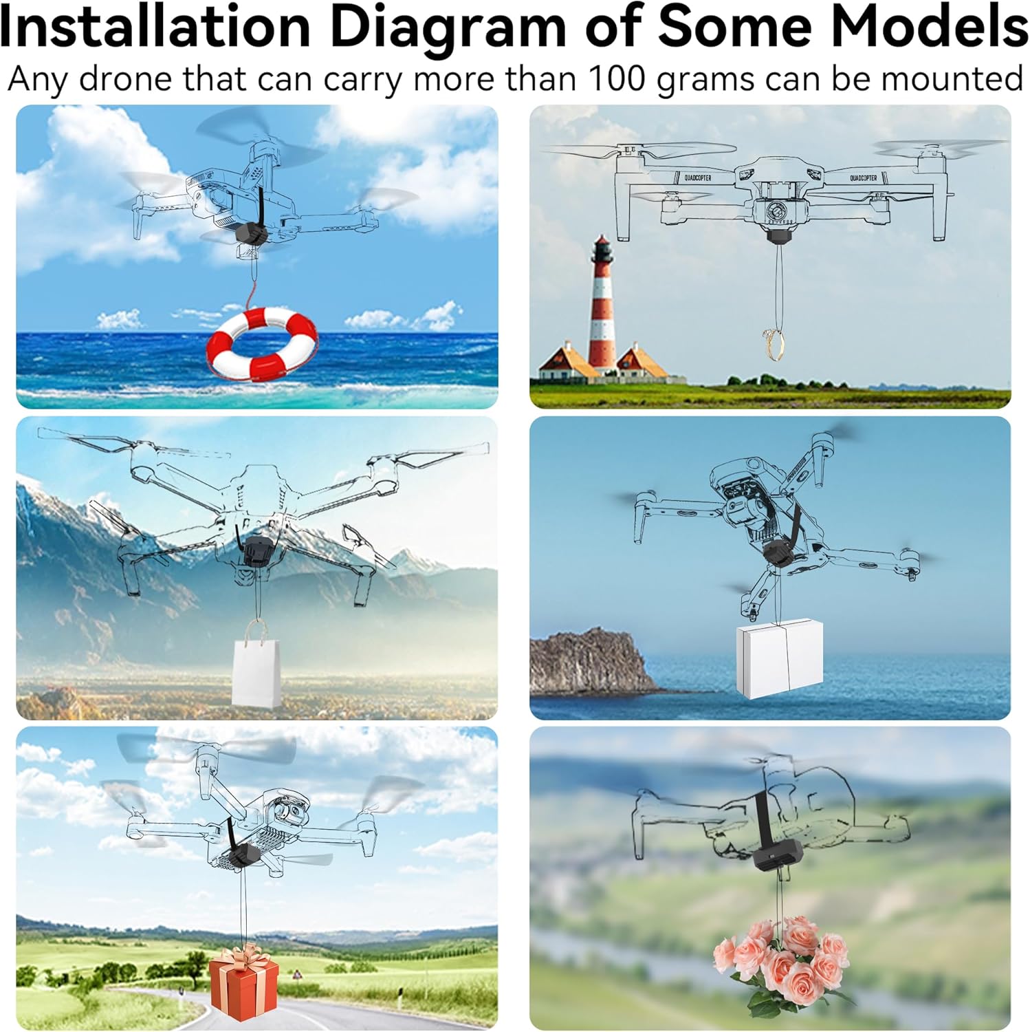 • Бърз монтаж: Монтажът с велкро няма да повреди корпуса на дрона. Просто завийте велкро закопчалка в отвора за регулиране, поставете я на подходящо място според размера на вашия дрон и я фиксирайте (ремъкът избягва сензора на пода на дрона). Закачете съответстващата примка на ключалката за хвърляне, за да натоварите предмета (закачете я според теглото на дрона).