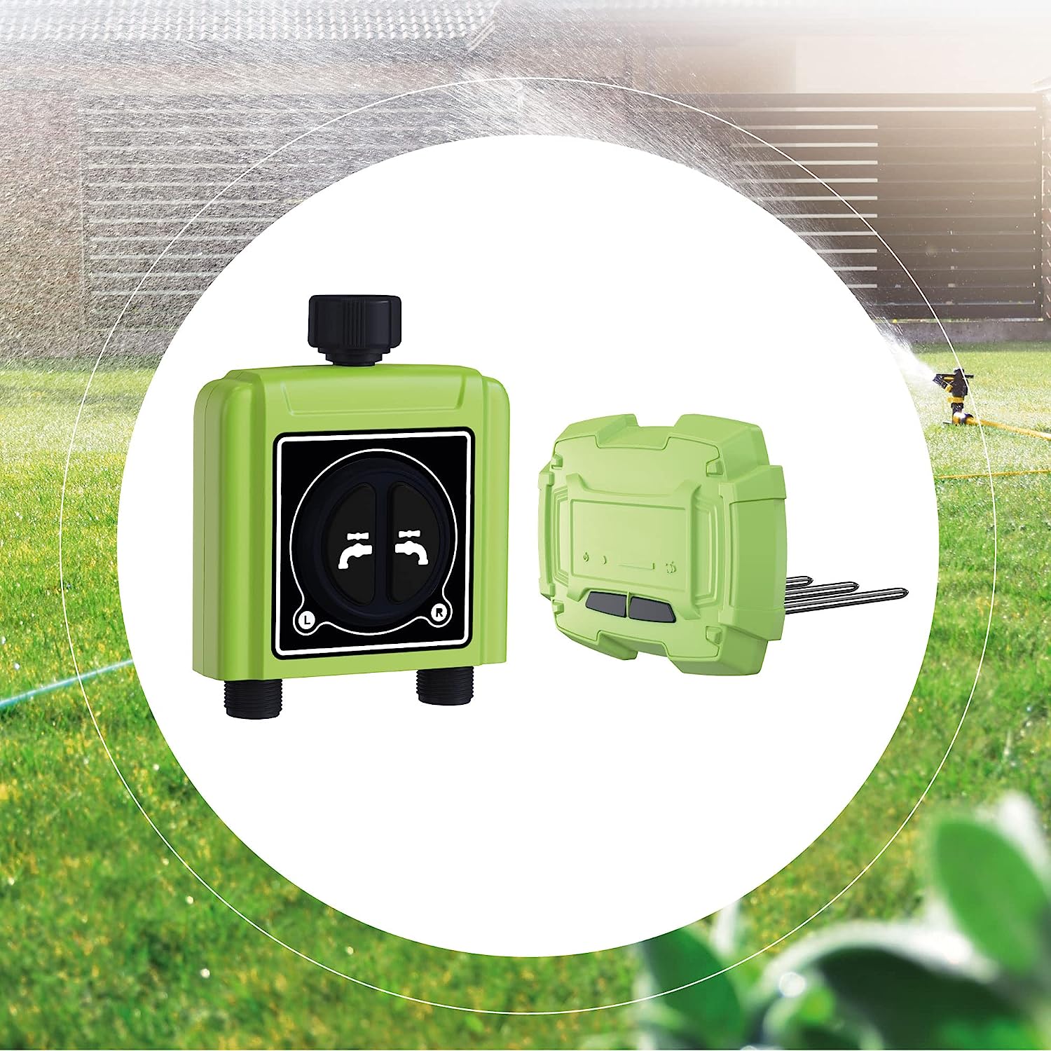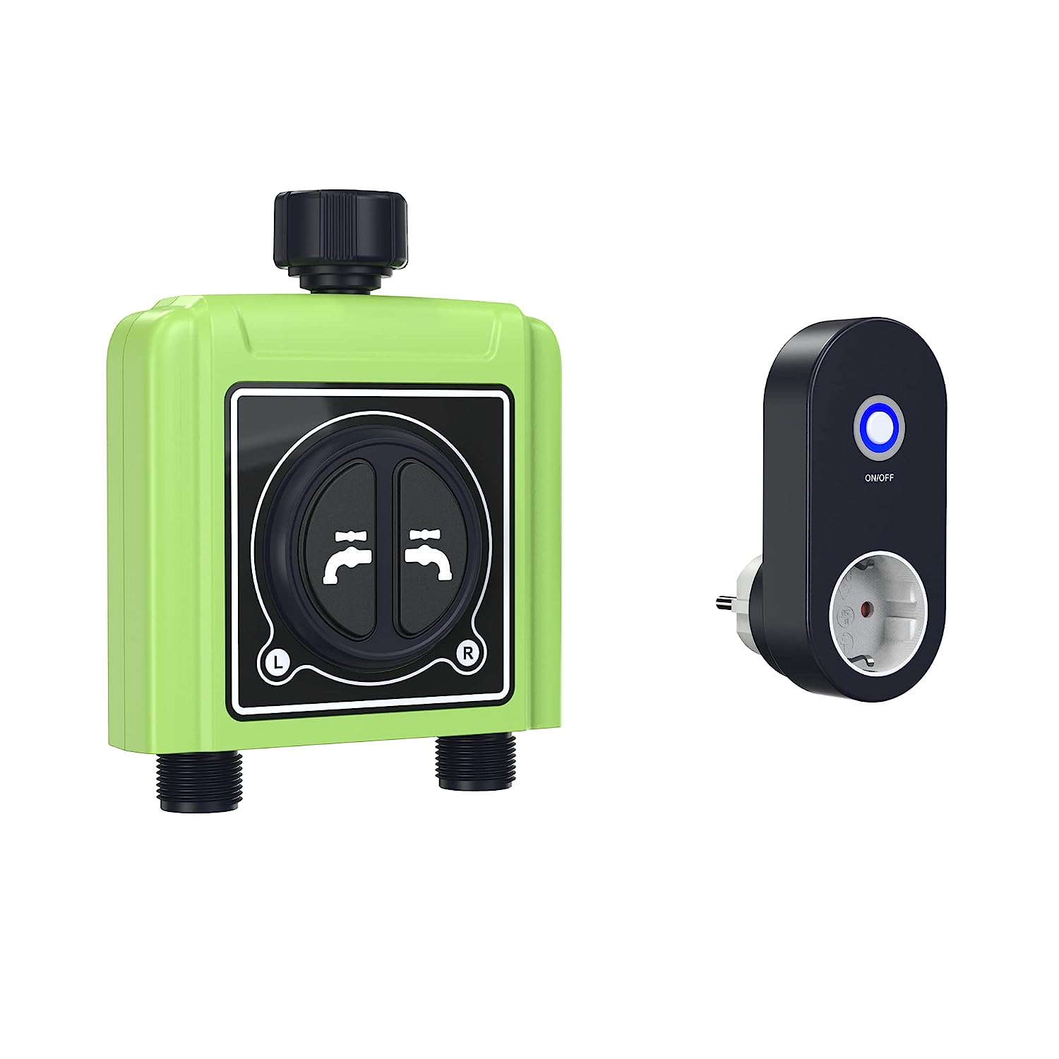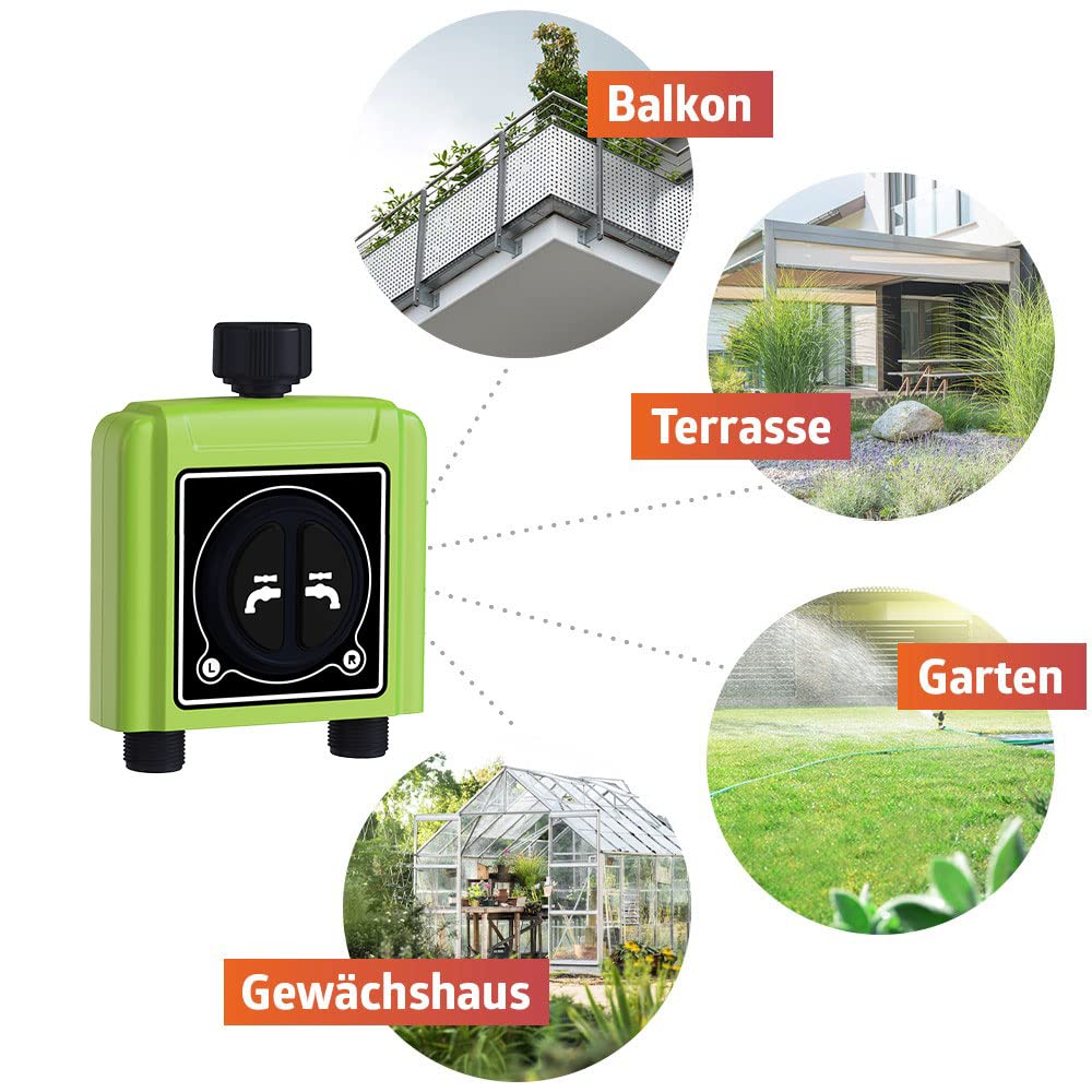 • Контролерът пасва на всички стандартни кранове и маркучи и може да се управлява ръчно с натискане на бутон. Устройството се интегрира в домашния Wi-Fi за нула време и се свързва с приложението, откъдето може да се програмира и контролира напояването. Компютърът за поливане работи както с Alexa & Co, така и с Tuya.