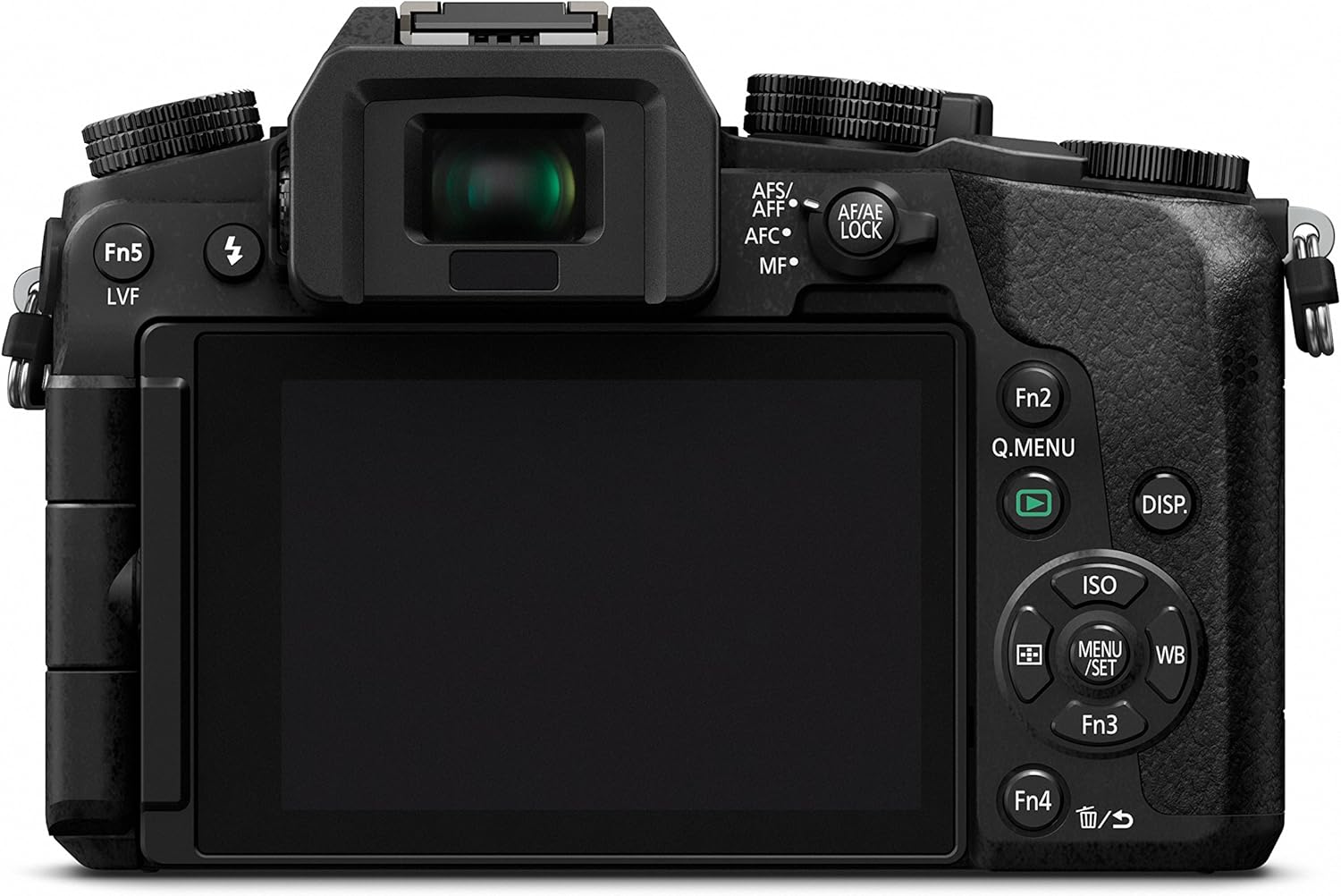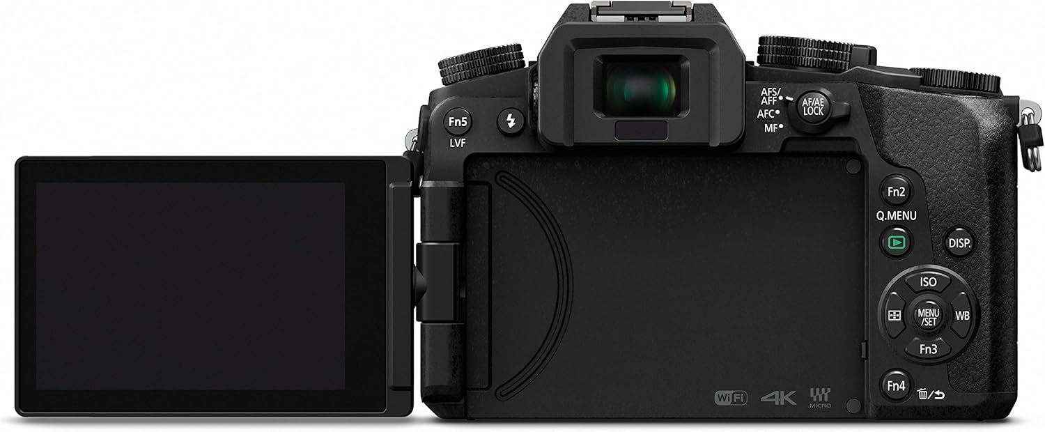 • Panasonic LUMIX system camera with OLED viewfinder and LCD touch screen.