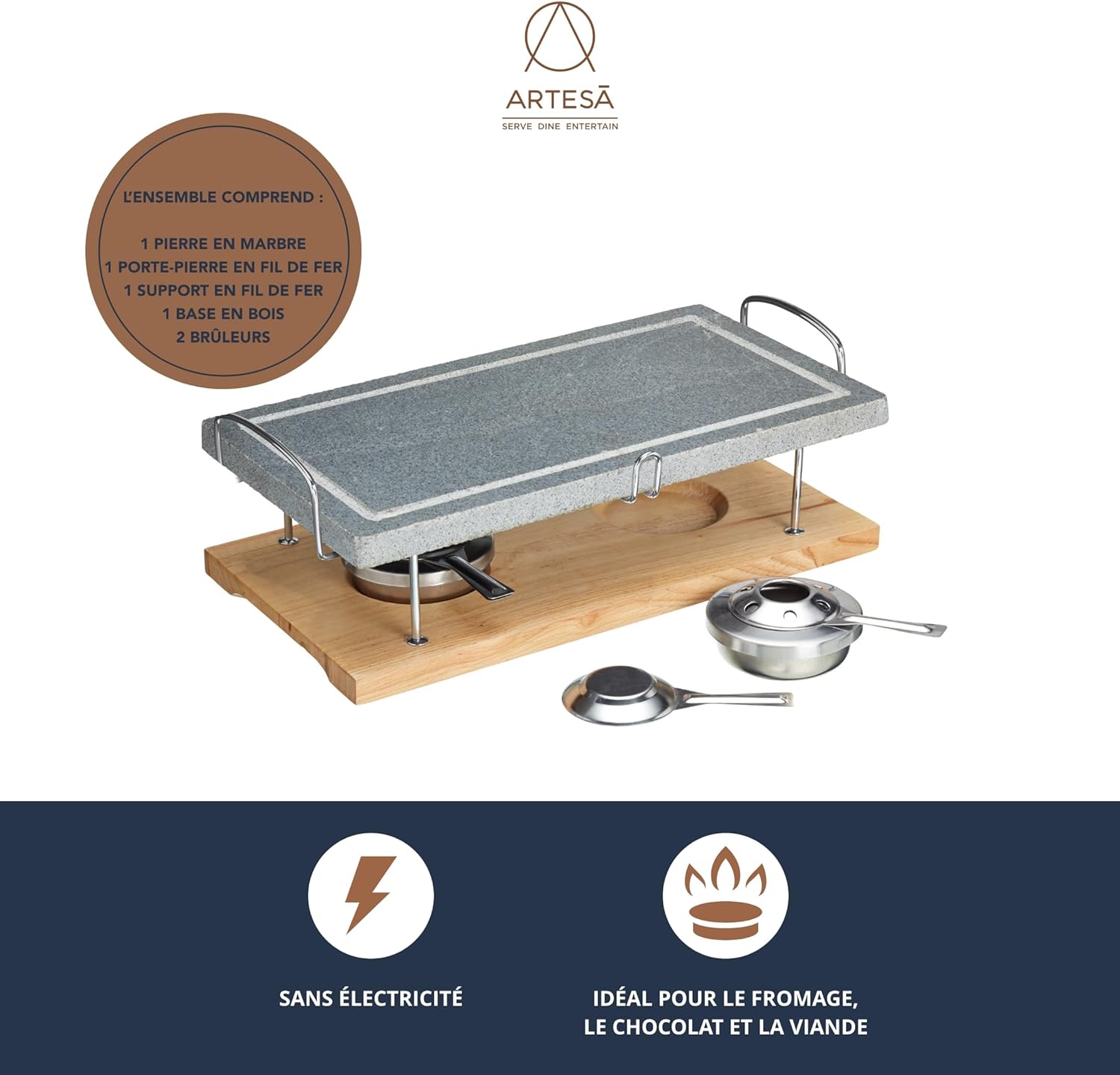 The burner set is complemented by a wooden scraper that allows the cheese to be moved in the pan as it melts and releases it from the pan when pouring.