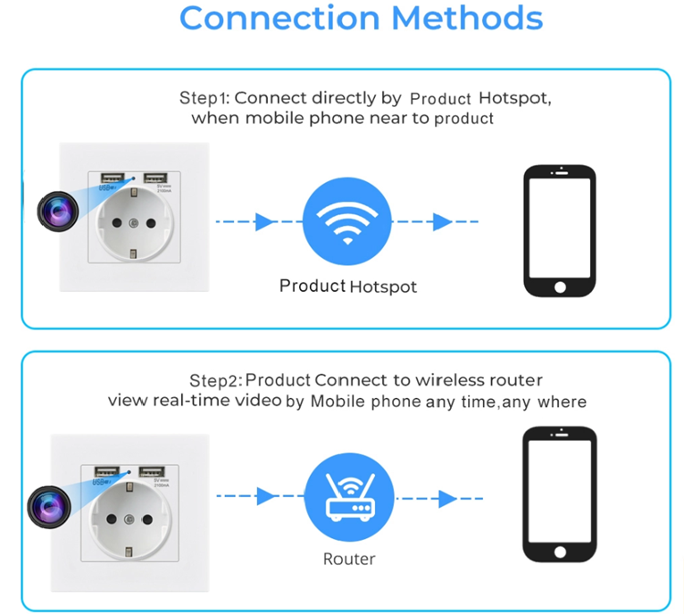Шпионската камера P2P ви позволява да преглеждате заснетото директно от телефона или таблета си, ако се намирате на разстояние до 5-10 метра от камерата. Или ако на мястото, където се намирате, има безжичен интернет, можете да свържете мини камерата директно към рутера си и резултатът е маскирана безжична IP камера, която ви позволява да наблюдавате от всяка точка на света.