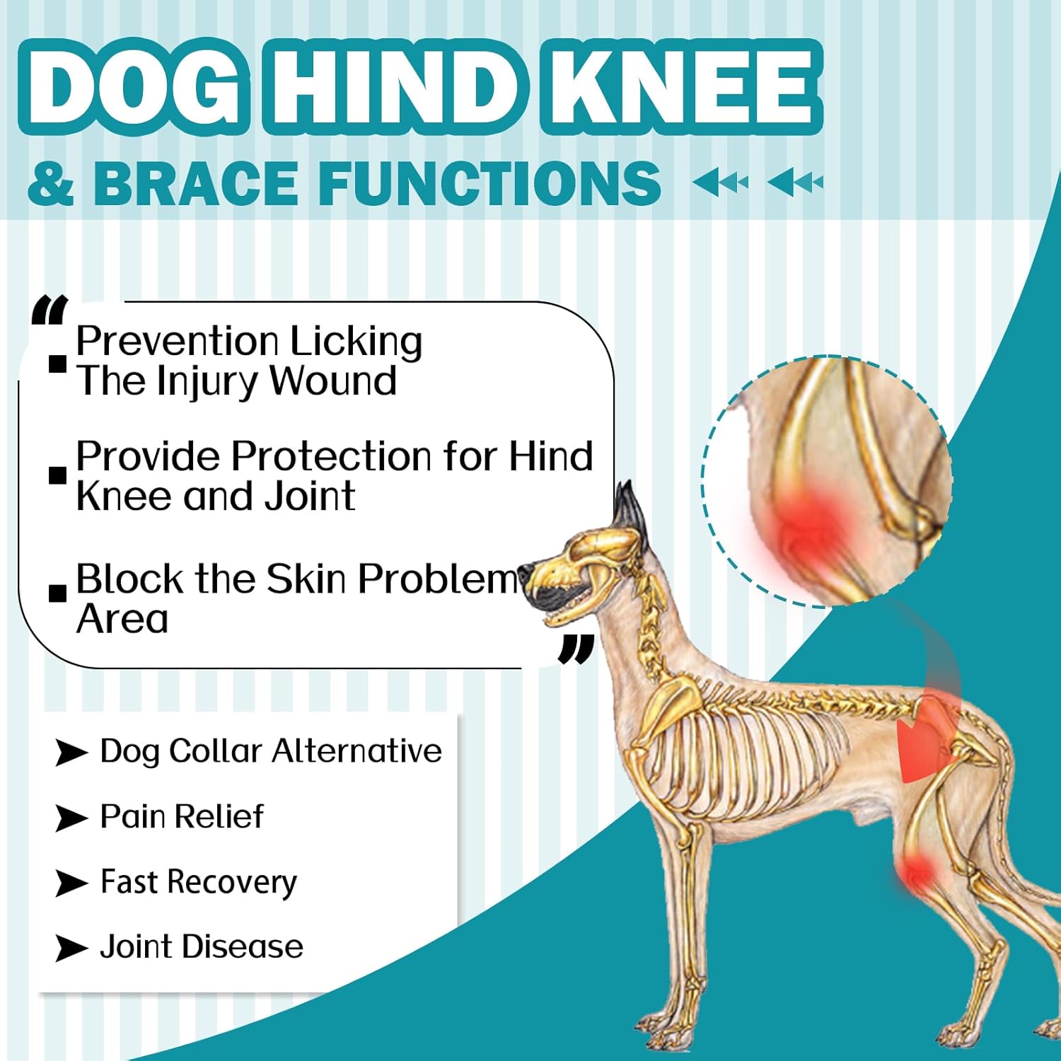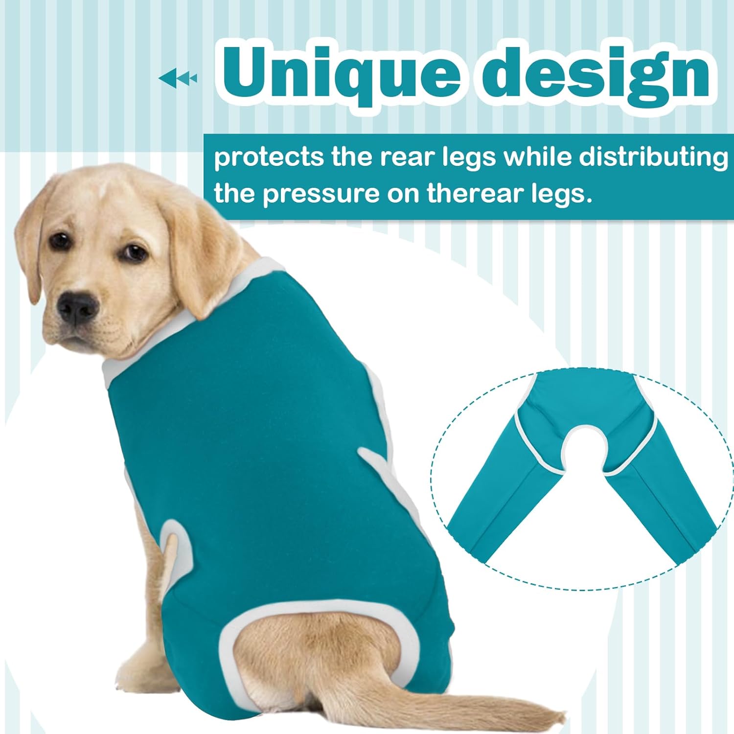 • Цялостна защита: Нашият костюм е експертно проектиран да предпази кучето ви от облизване на рани по краката, хирургични разрези или следоперативни зони. При някои кучета и двете колена се ремонтират едновременно – нашият костюм осигурява защита и за двата задни крака.
