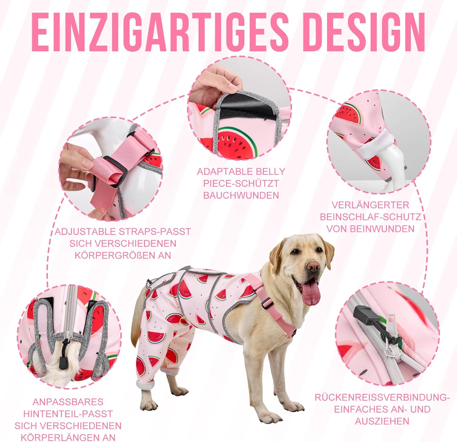 • [ЗАЩИТА ОТ РАНИ] Този следоперативен костюм за кучета покрива и защитава рани и е особено подходящ за употреба след коремни или крака операции, като кастрация или TPLO, луксация на пателата и възстановяване на кръстни връзки. Не е подходящ за кучета след операция на гръдния кош. Този костюм не е подходящ за кучета с много къси или много мускулести крака, като английски булдози, басет хрътки, дакели, шотландски териери, коргита и др.