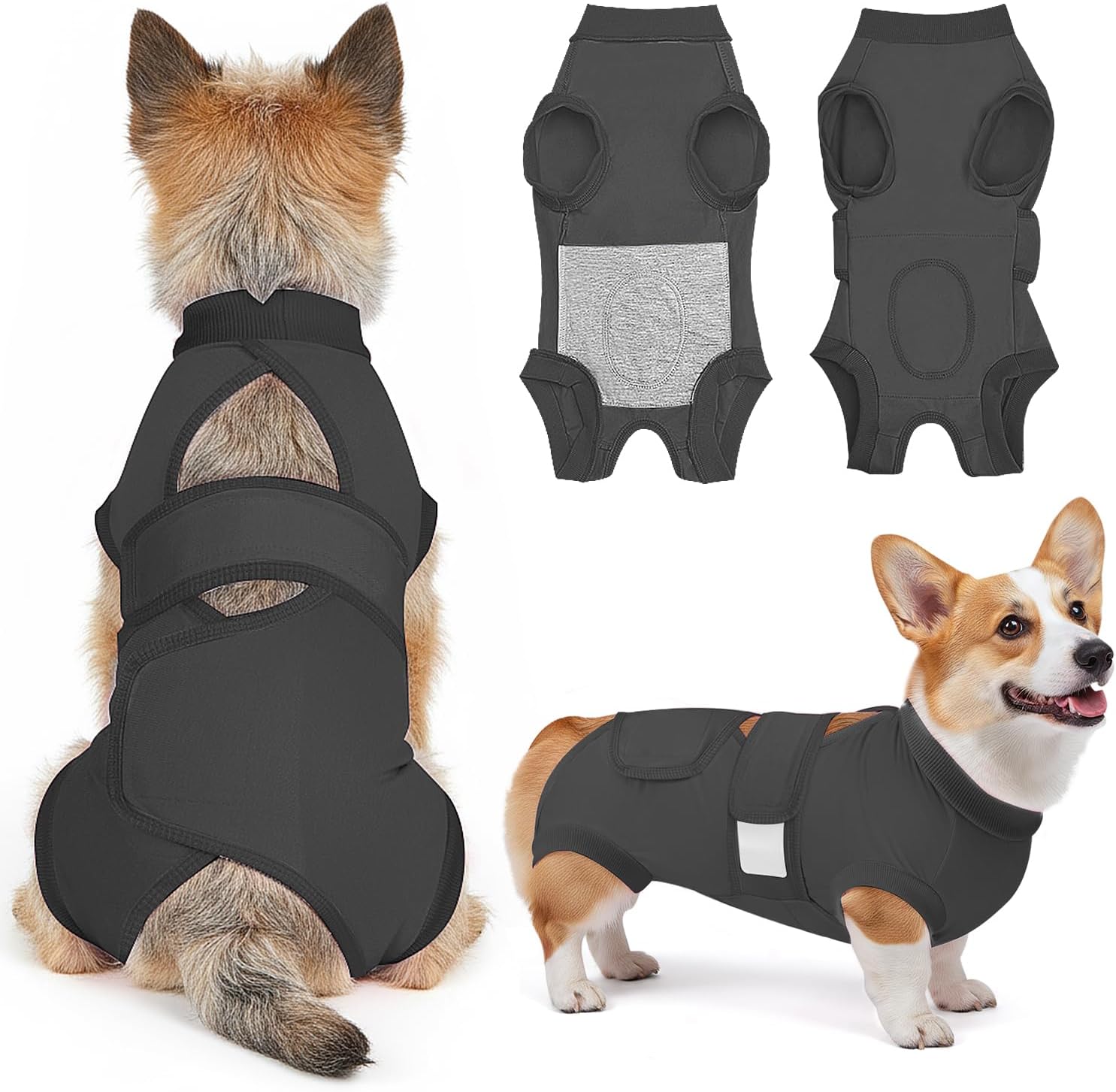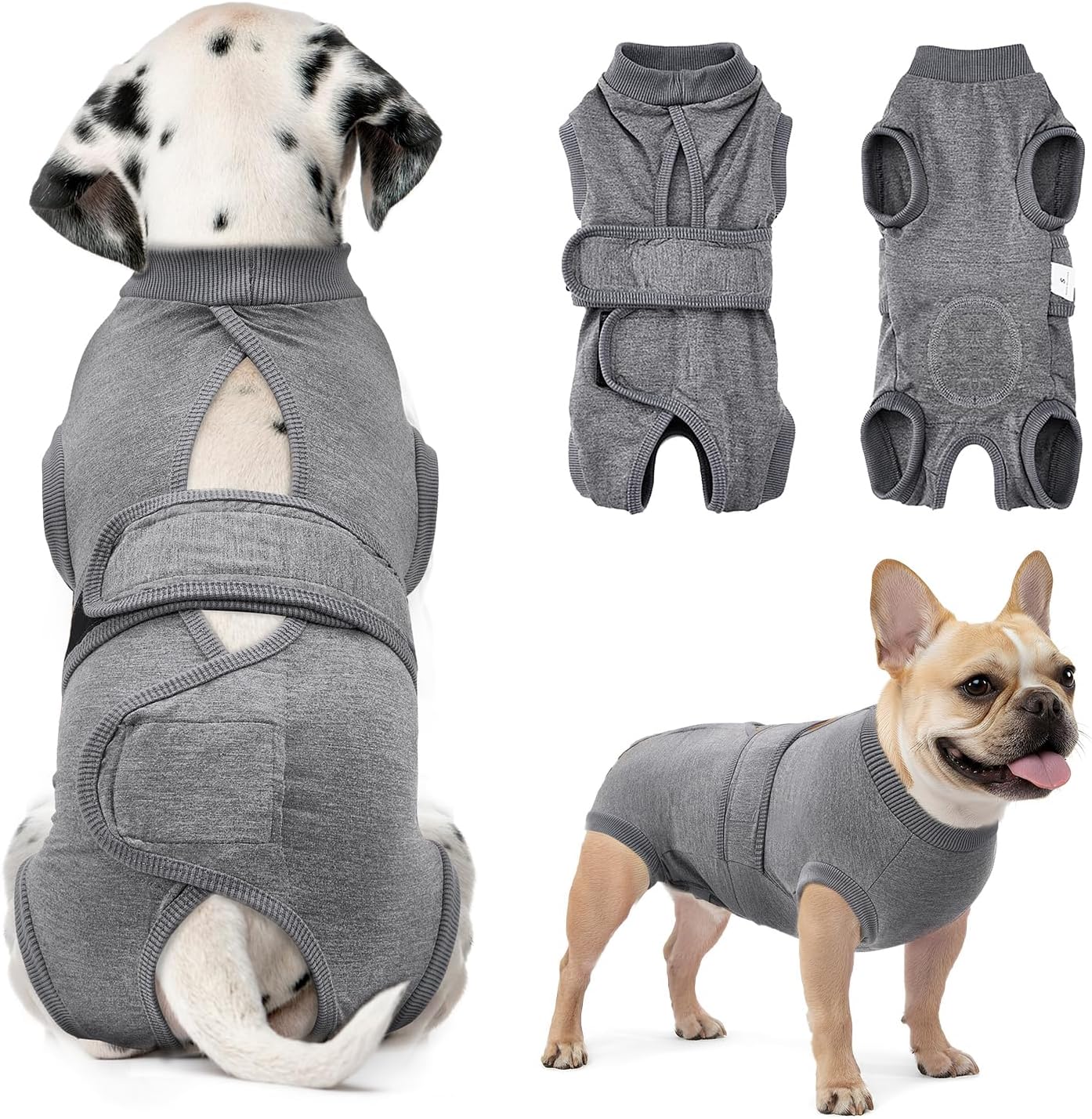 Следоперативен боди за кучета, дишащ, регулируем, еднокомпонентен, за женски и мъжки кучета, против облизване и защита от рани, алтернатива на Е-каишките и конусите след операция, сив, размер M