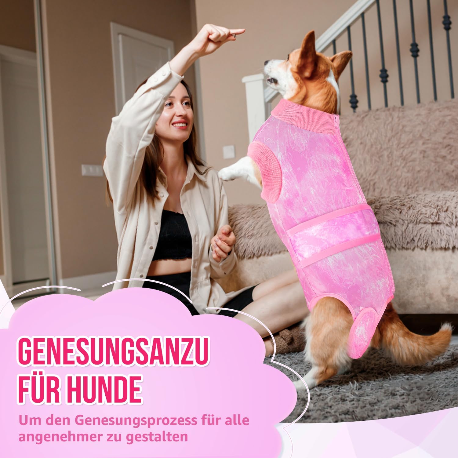 • 【Универсална употреба】 – Костюмът за възстановяване на кучета е подходящ за последващи грижи, например след кастрация или стерилизация, както и за следродилна грижа. Той е добра алтернатива на конуса, тъй като позволява на кучето да играе и да се храни свободно. След възстановяване, костюмът за възстановяване може да се носи и като удобно облекло за дома.
