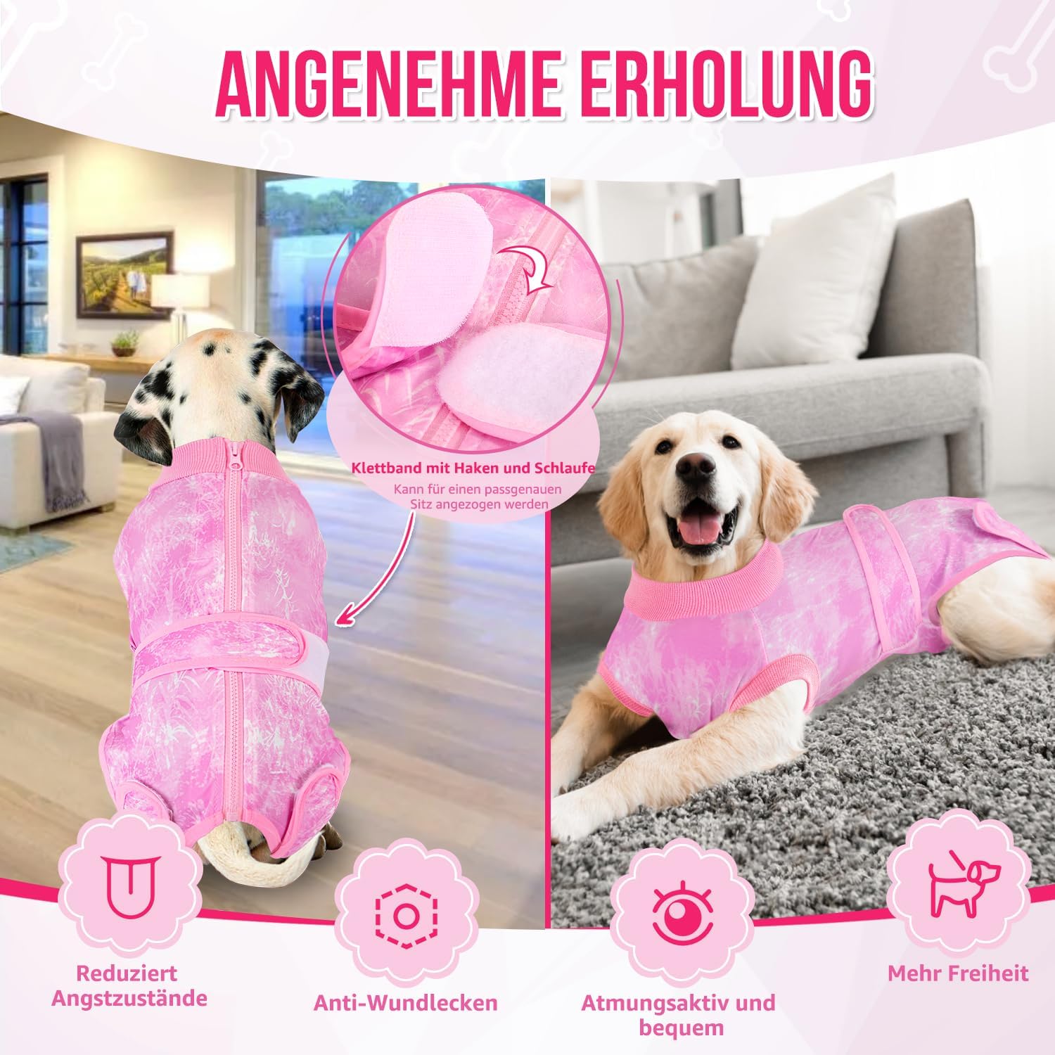 Следоперативен боди за кучета, костюм за защита от рани за женски и мъжки кучета с цип и велкро колан - против облизване и защита от рани, дишащ еднокомпонентен за кучета след операция (розов, XL)