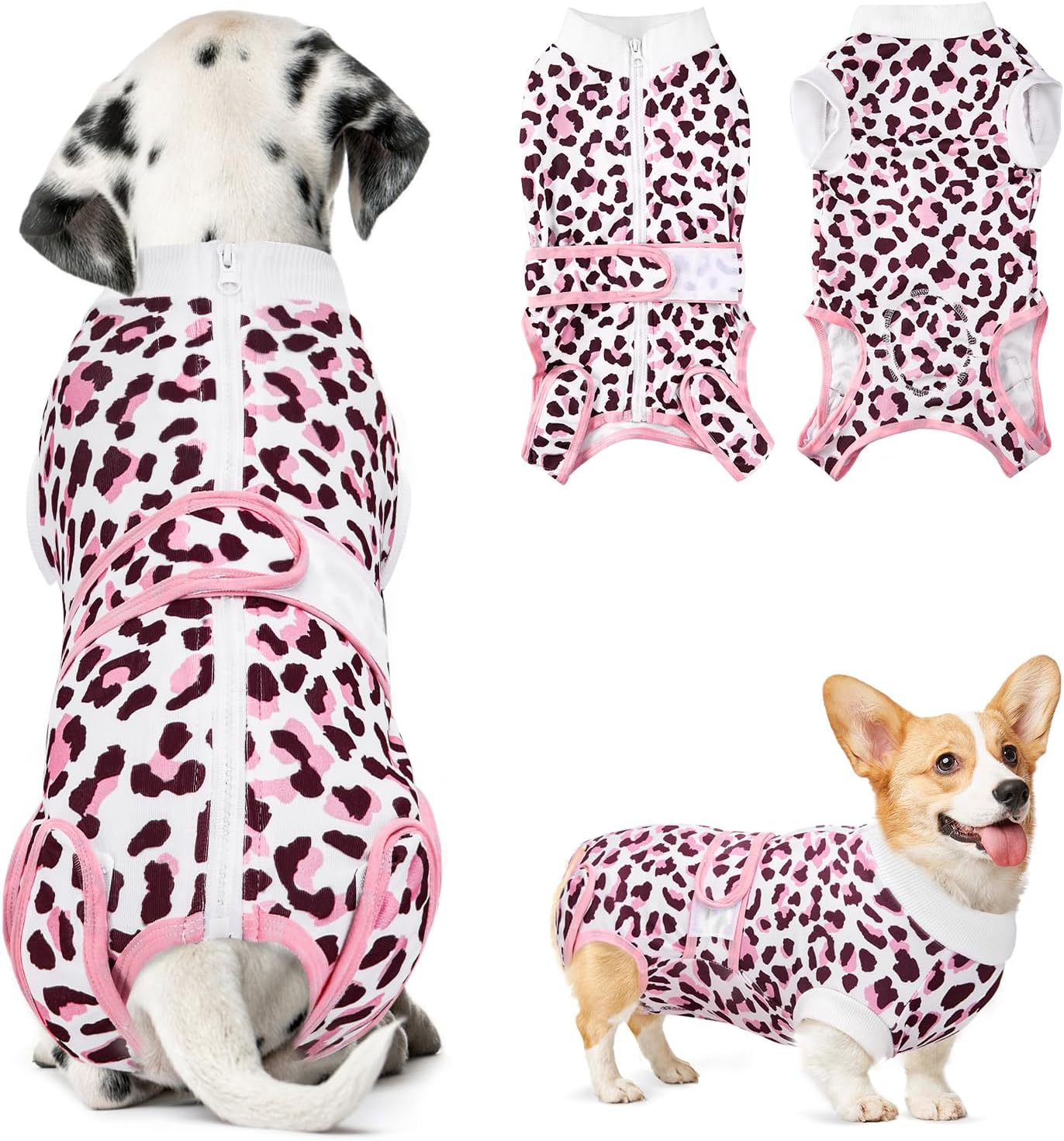 Следоперативен боди за кучета, костюм за защита от рани за женски и мъжки кучета с цип и велкро колан - против облизване и защита от рани, дишащ еднокомпонентен за кучета след операция (розово-бял, XXL)