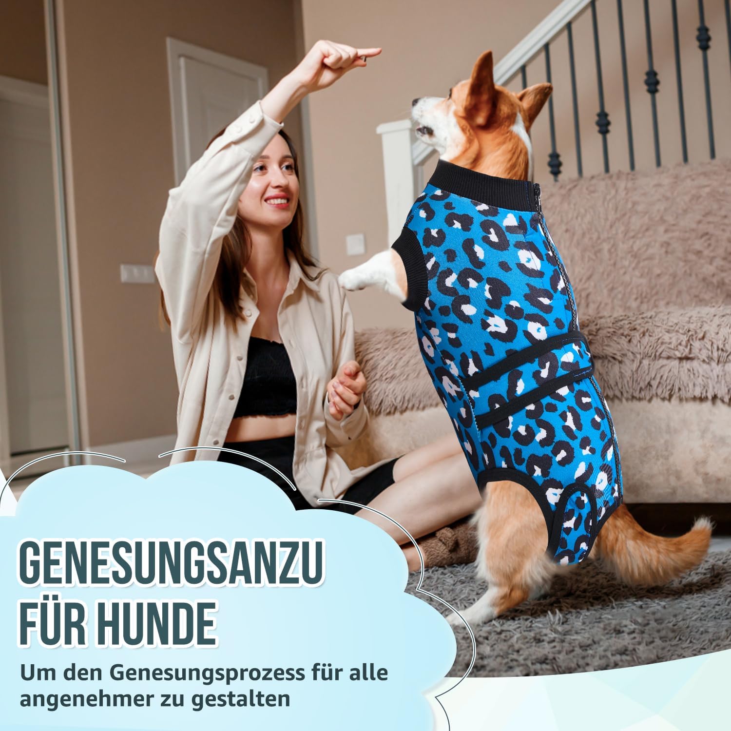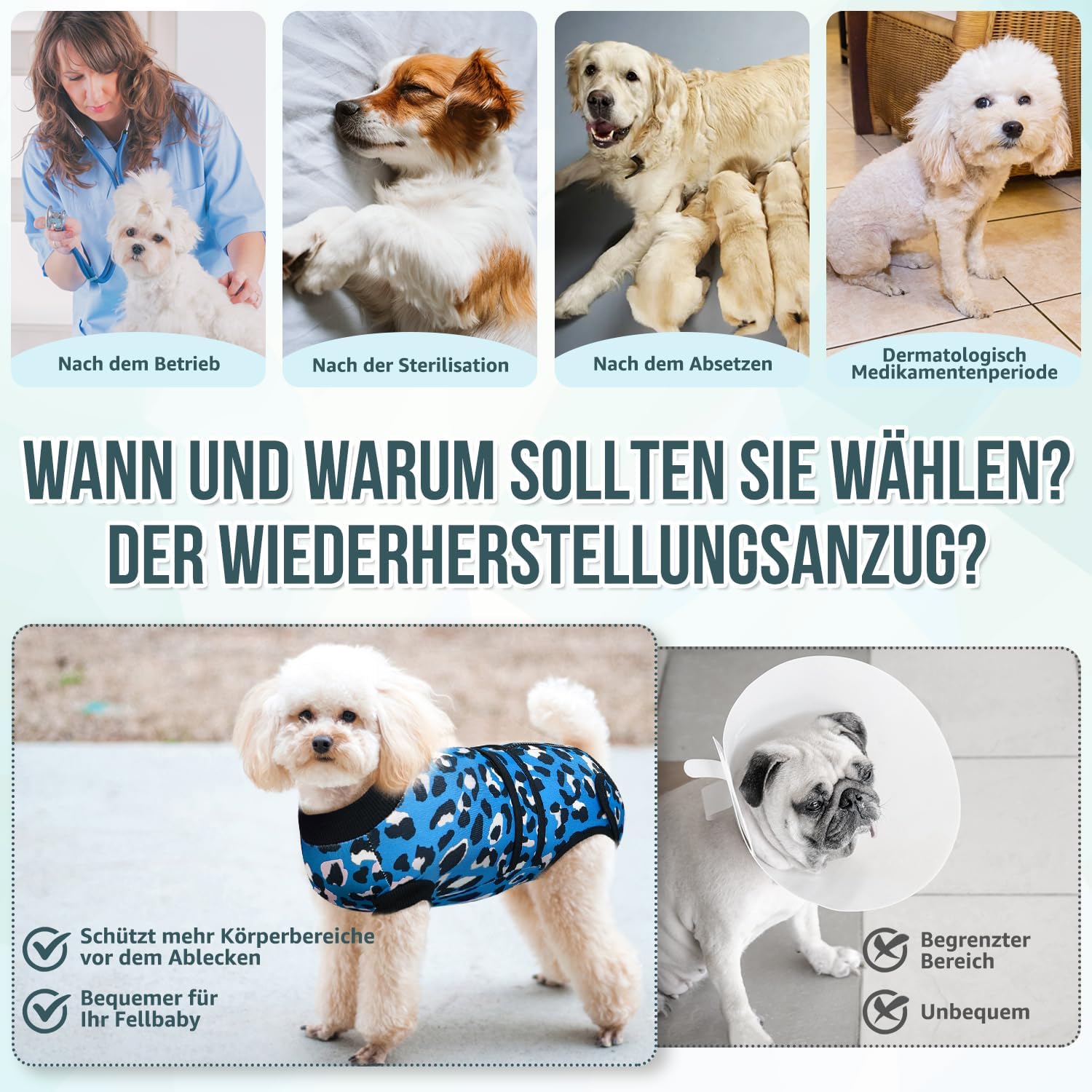 • 【Универсална употреба】 – Костюмът за възстановяване на кучета е подходящ за последващи грижи, например след кастрация или стерилизация, както и за следродилна грижа. Той е добра алтернатива на конуса, тъй като позволява на кучето да играе и да се храни свободно. След възстановяване, костюмът за възстановяване може да се носи и като удобно облекло за дома.