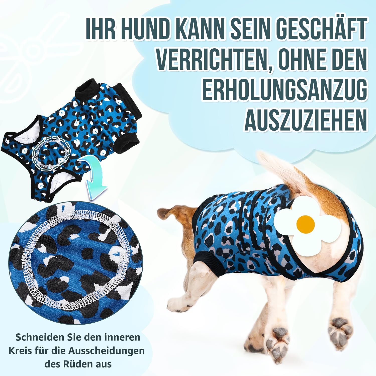 • 【Подходящ за тоалетна и унисекс】 – Това позволява на домашните любимци лесно да използват тоалетната, без да се налага да свалят или цапат дрехите си. Следоперативният костюм за кучета елиминира необходимостта от често събличане и обличане на костюма за възстановяване, осигурявайки по-голямо спокойствие. За мъжки кучета, моля, изрежете кръглата маркировка на корема, за да се осигури възможност за елиминиране.