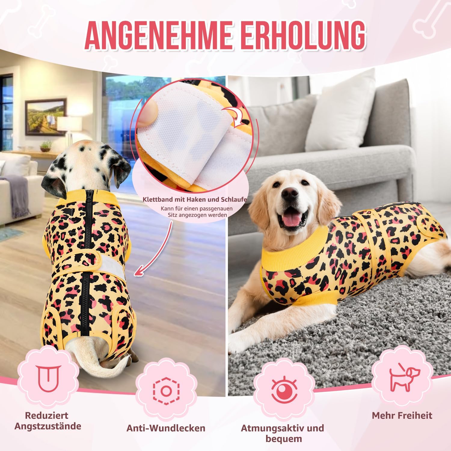 • 【Универсална употреба】 – Костюмът за възстановяване на кучета е подходящ за последващи грижи, например след кастрация или стерилизация, както и за следродилна грижа. Той е добра алтернатива на конуса, тъй като позволява на кучето да играе и да се храни свободно. След възстановяване, костюмът за възстановяване може да се носи и като удобно облекло за дома.