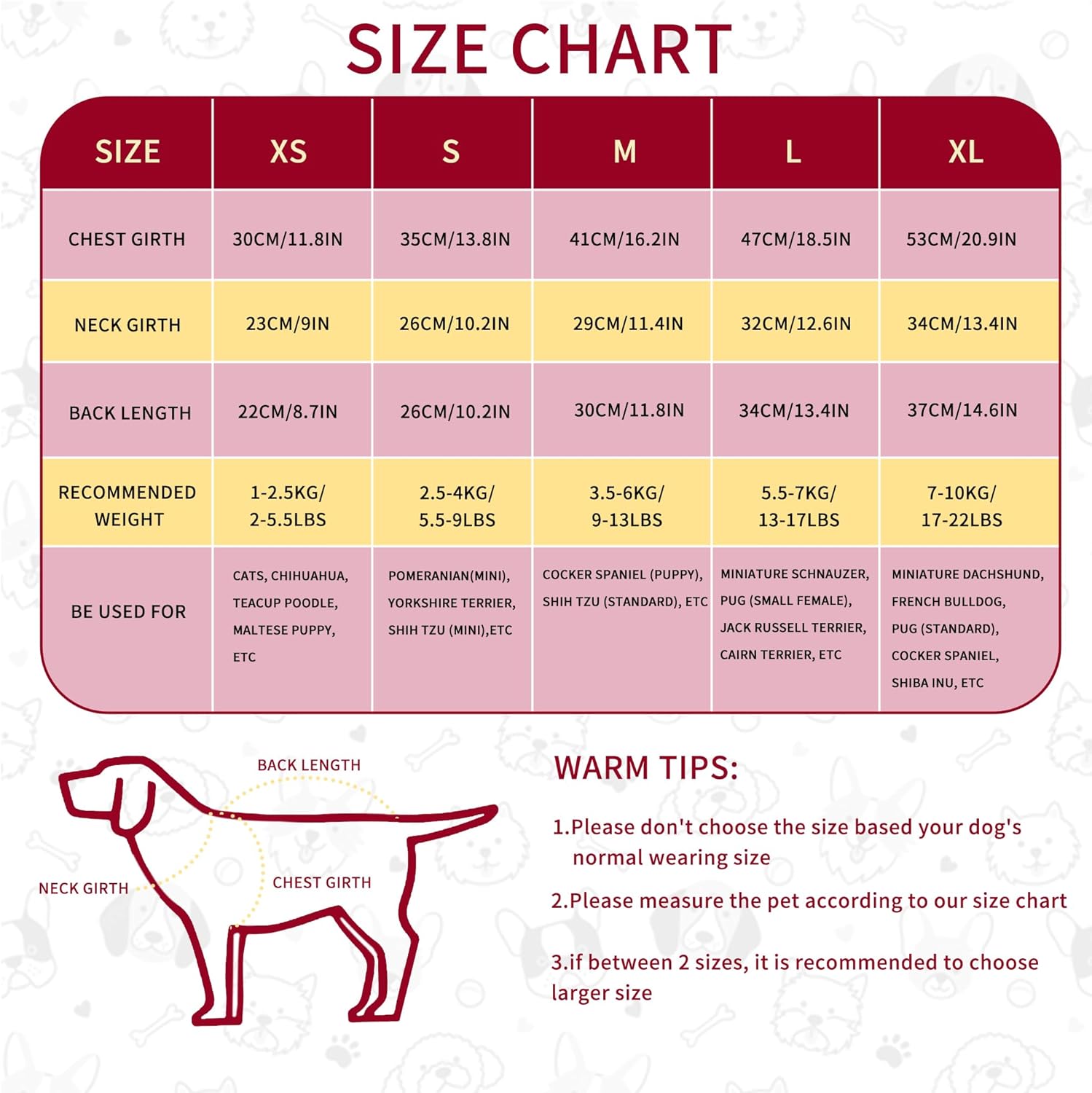 • Забележка за размера: Този боди за кучета се предлага в 5 размера (XS-XL) и е подходящ за много малки, малки и средни кучета/котки, като чихуахуа, йоркширски териери, померан, миниатюрен шнауцер и др. Моля, вземете мерки преди да поръчате. За междинни размери изберете по-големия размер (не избирайте единствено въз основа на обичайния размер на дрехите).