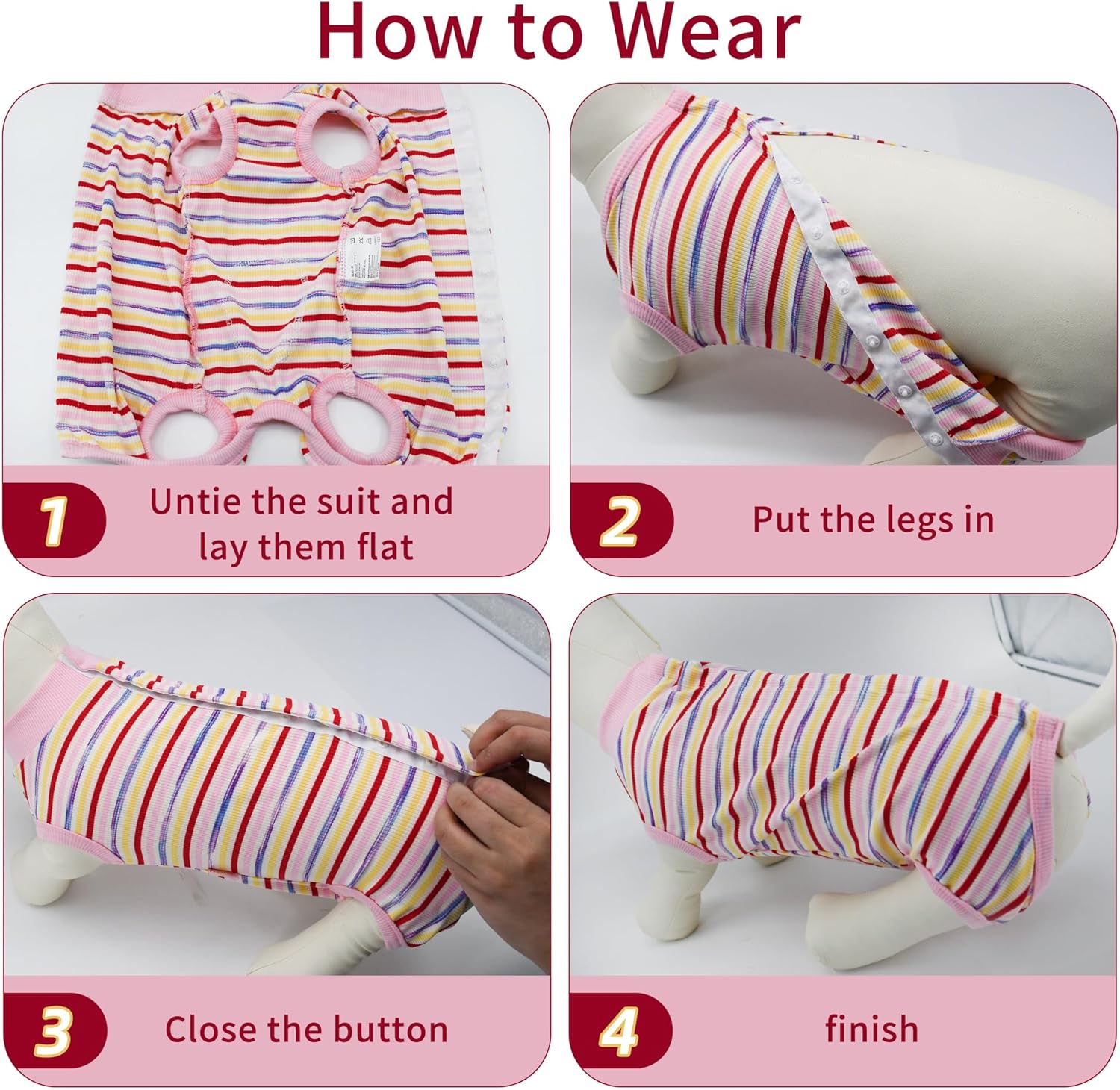 • Многофункционален: Този следоперативен гащеризон за кучета е идеален за различни нужди, включително кастрация, грижа за рани и отбиване; той предотвратява облизване, хапане и инфекции, като гарантира, че кучето ви се чувства комфортно и щастливо по време на възстановяване; може да се използва и като пижама за вътрешна употреба, за да се предотврати линее и да се поддържа домът ви чист.