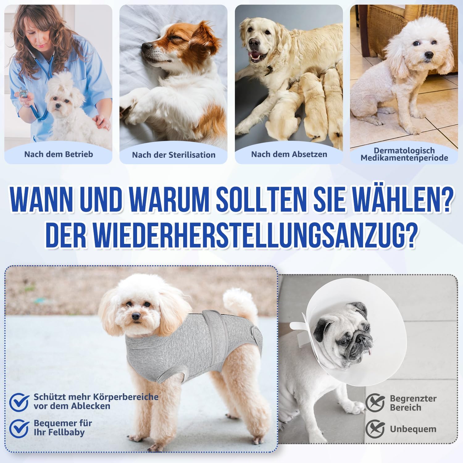 • 【Универсална употреба】 – Костюмът за възстановяване на кучета е подходящ за последващи грижи, например след кастрация или стерилизация, както и за следродилна грижа. Той е добра алтернатива на конуса, тъй като позволява на кучето да играе и да се храни свободно. След възстановяване, костюмът за възстановяване може да се носи и като удобно облекло за дома.