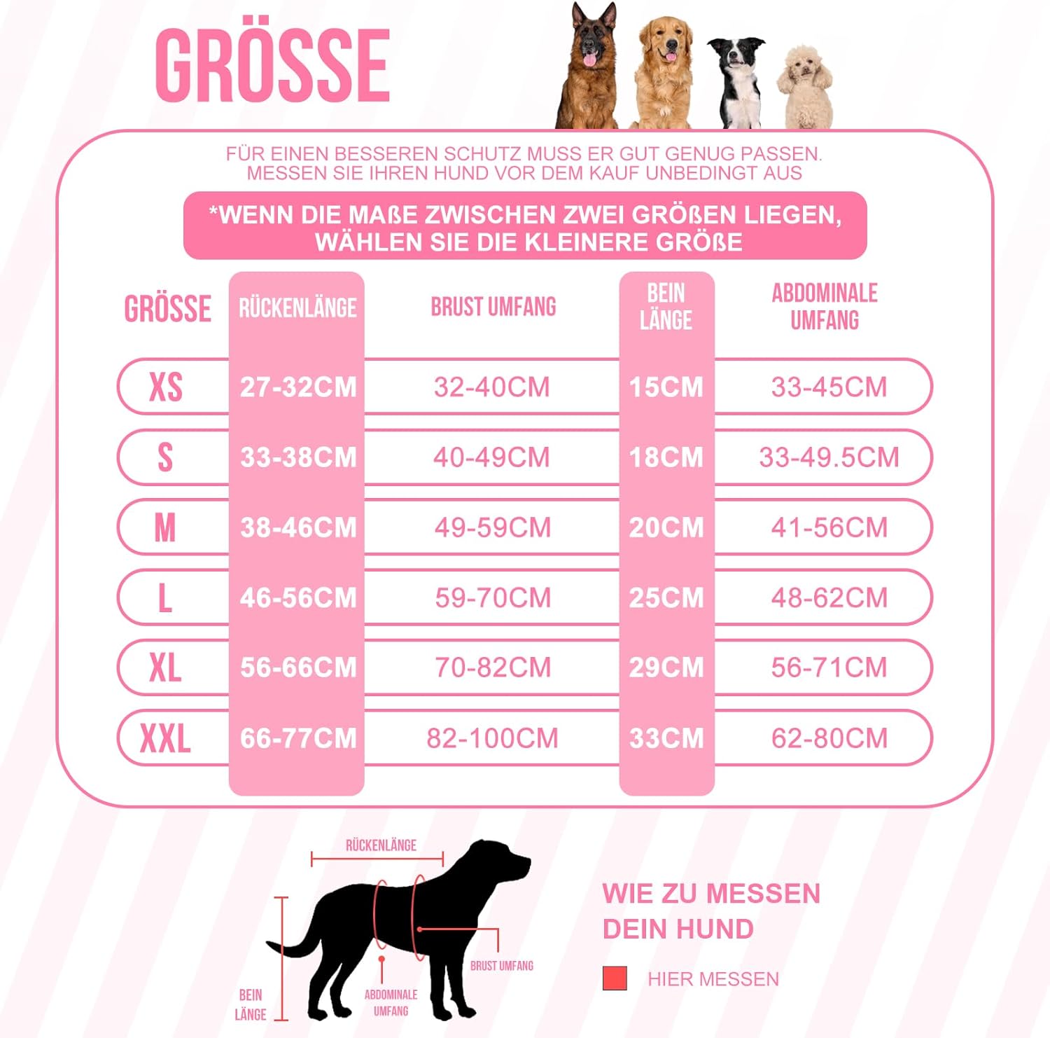 • [ЗАЩИТА ОТ РАНИ] Този следоперативен костюм за кучета покрива и защитава рани и е особено подходящ за употреба след коремни или крака операции, като кастрация или TPLO, луксация на пателата и възстановяване на кръстни връзки. Не е подходящ за кучета след операция на гръдния кош. Този костюм не е подходящ за кучета с много къси или много мускулести крака, като английски булдози, басет хрътки, дакели, шотландски териери, коргита и др.