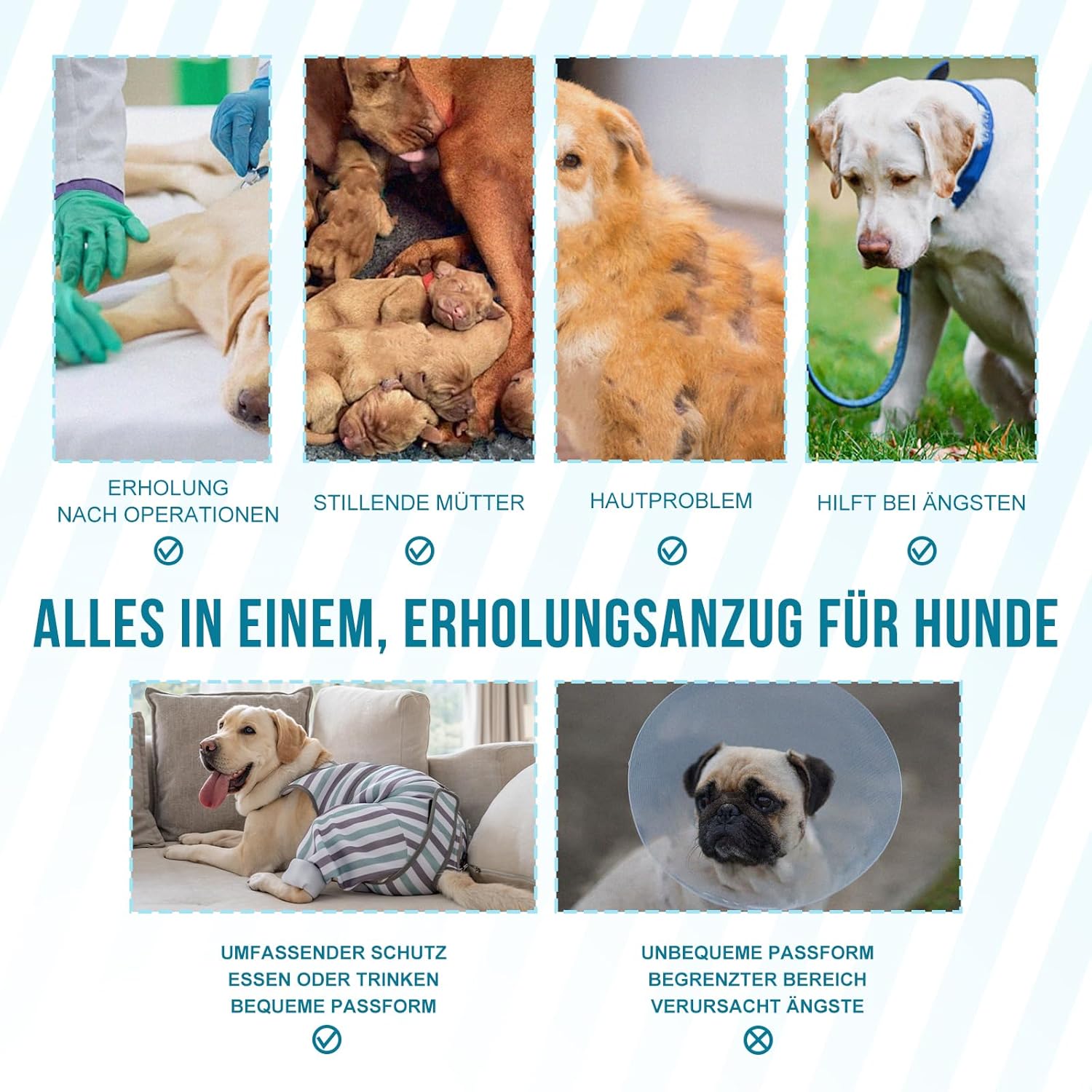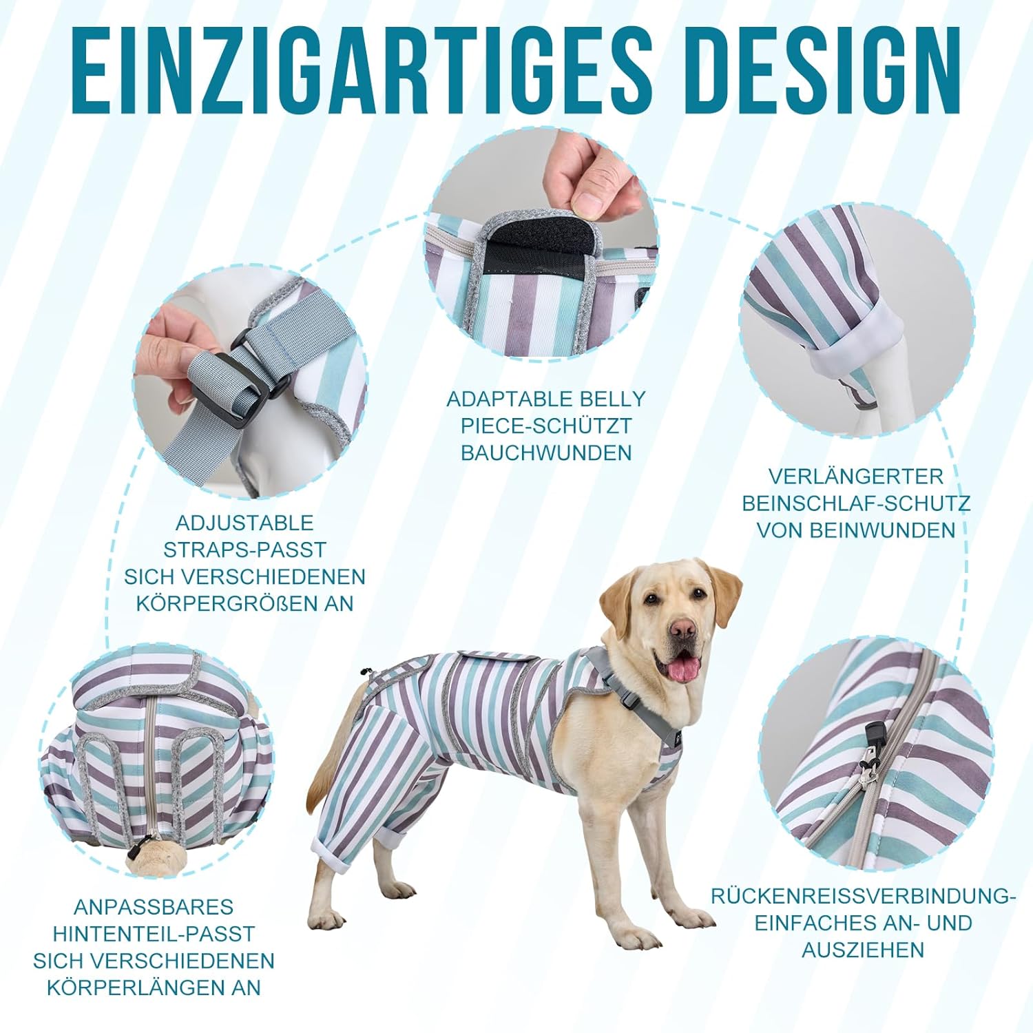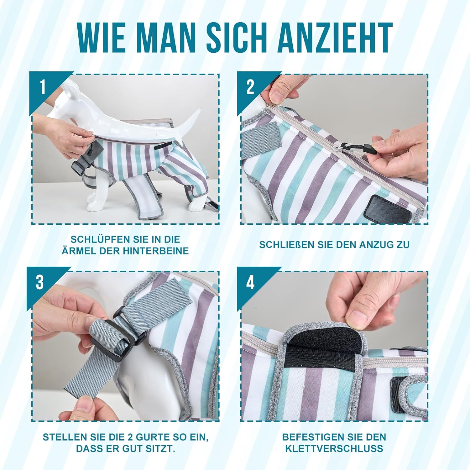 • [ЗАЩИТА ОТ РАНИ] Този следоперативен костюм за кучета покрива и защитава рани и е особено подходящ за употреба след коремни или крака операции, като кастрация или TPLO, луксация на пателата и възстановяване на кръстни връзки. Не е подходящ за кучета след операция на гръдния кош. Този костюм не е подходящ за кучета с много къси или много мускулести крака, като английски булдози, басет хрътки, дакели, шотландски териери, коргита и др.