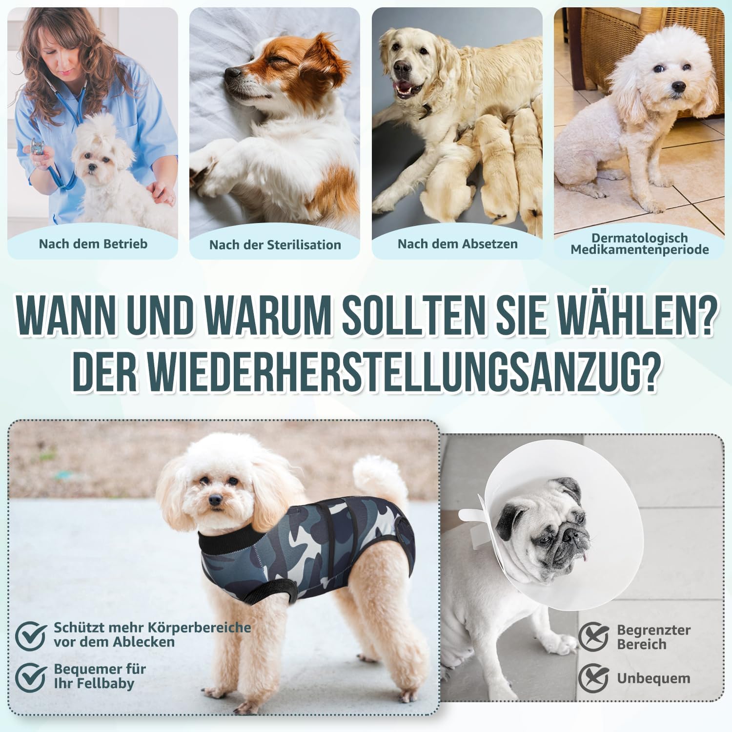 • 【Универсална употреба】 – Костюмът за възстановяване на кучета е подходящ за последващи грижи, например след кастрация или стерилизация, както и за следродилна грижа. Той е добра алтернатива на конуса, тъй като позволява на кучето да играе и да се храни свободно. След възстановяване, костюмът за възстановяване може да се носи и като удобно облекло за дома.