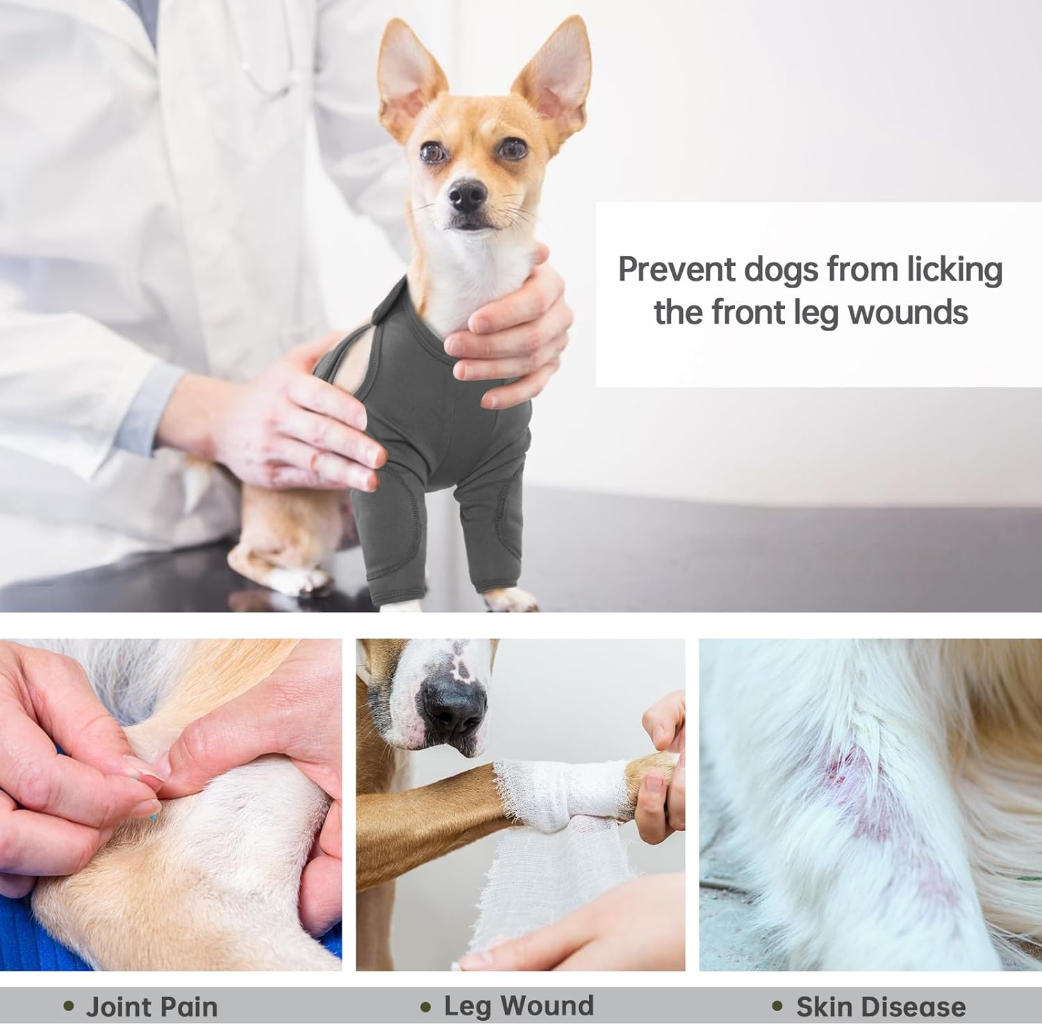 • [Алтернатива на конуса] Защитата за рани по краката на кучетата е чудесна алтернатива на конуса след операция. Хирургичният костюм за кучета може да предотврати облизването на рани по предните им крака от страна на кучето, а също така позволява на кучето ви да се движи по-свободно, без да бъде ограничено, докато се храни, спи и играе.