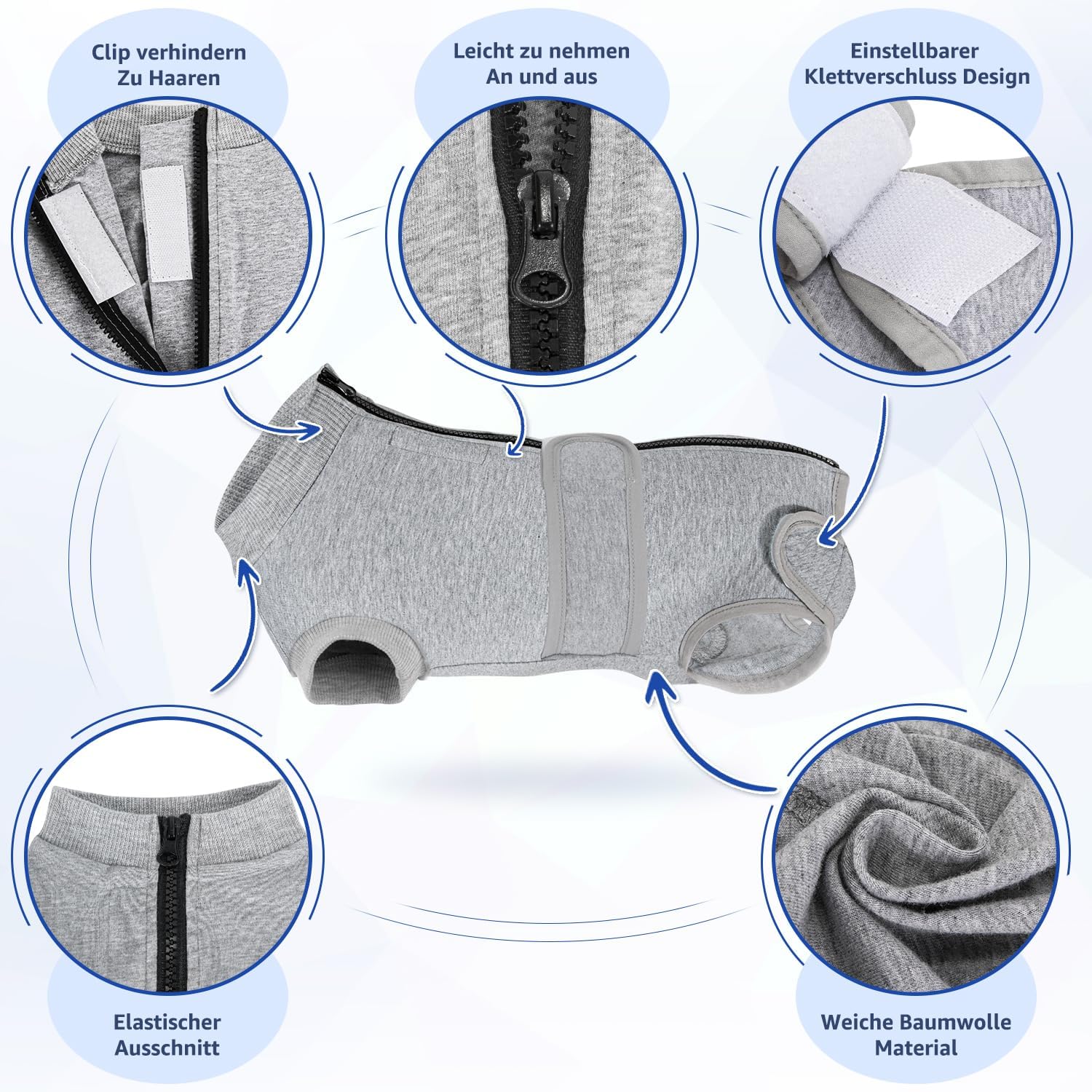 Следоперативно боди за кучета, защитни костюми за рани за женски и мъжки кучета с цип и велкро колан - против облизване и защита от рани, дишащ еднокомпонентен костюм за кучета след операция (сив, S)