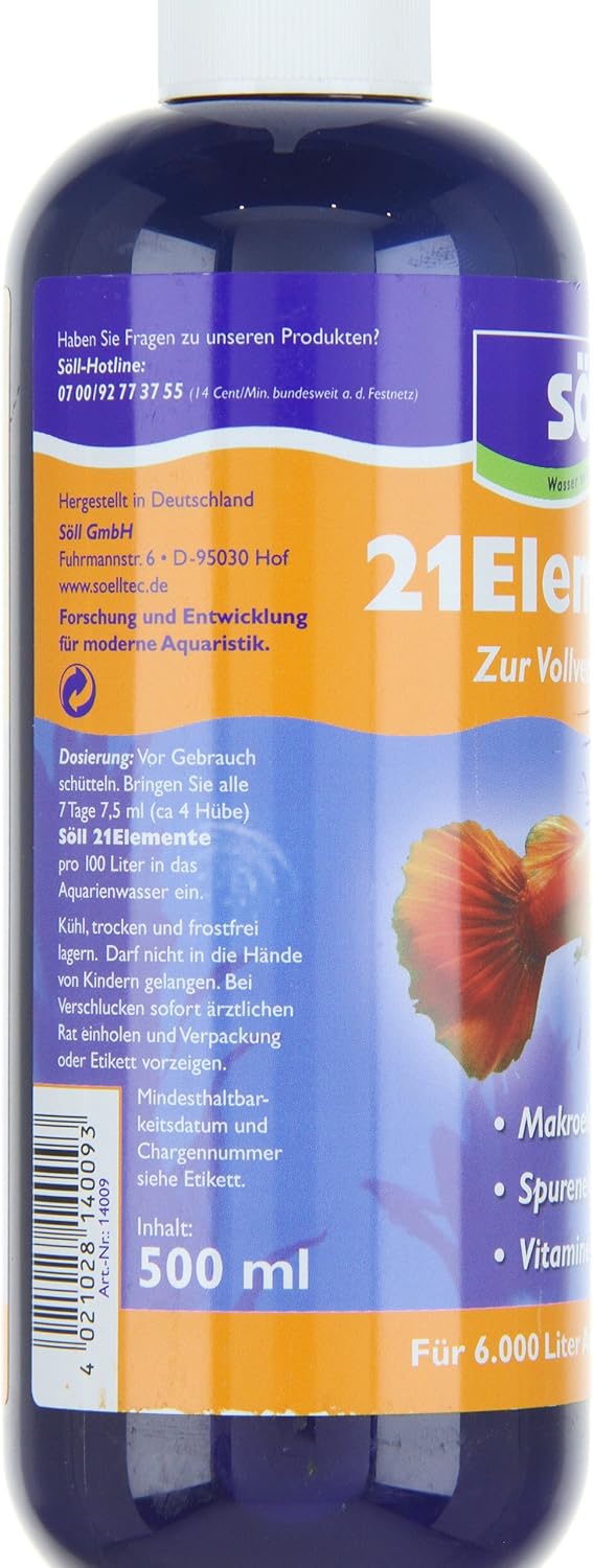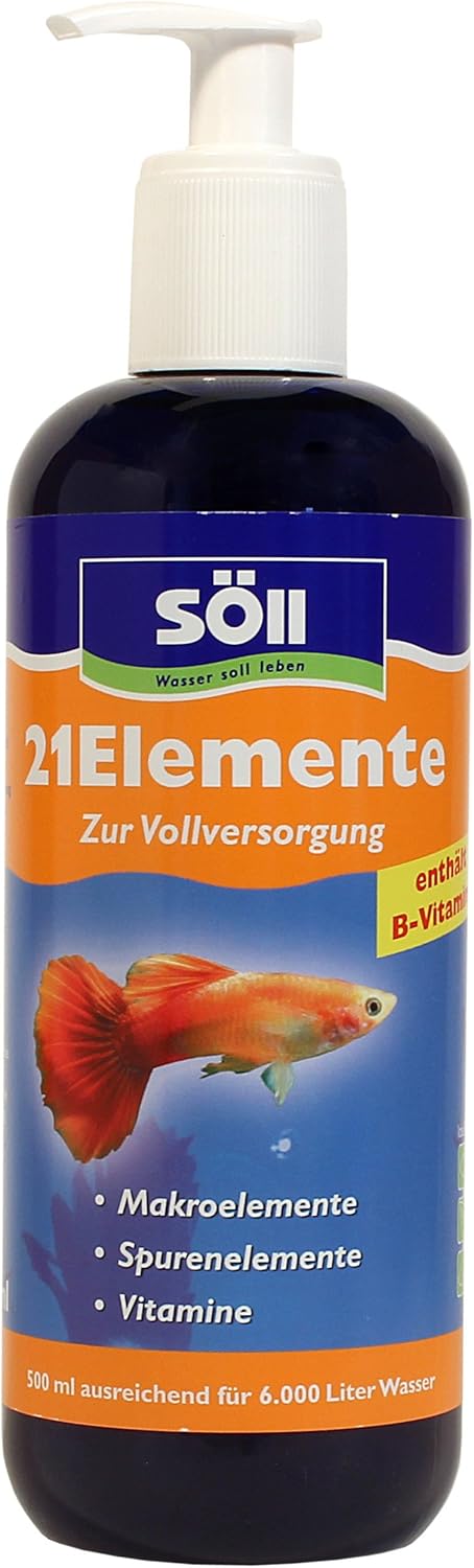 • ЗДРАВЕ НА АКВАРИУМА: Високоефективен препарат за третиране на вода Söll 21 Elements – 500 мл за до 6000 литра аквариумна вода, с основни минерали и витамини за рибите