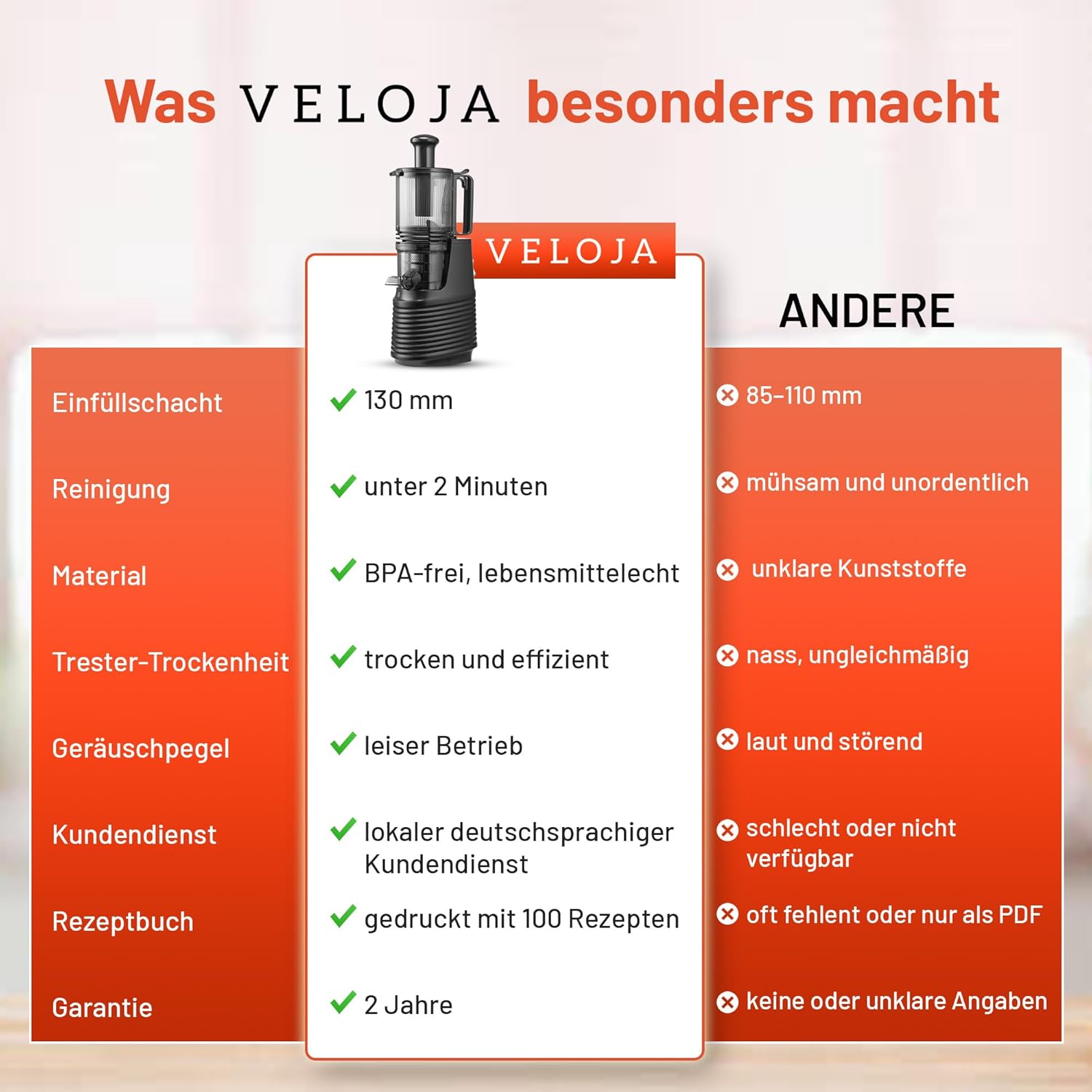 • 1. Изключително широк пълнещ вал 130 мм - изцежда плодове и зеленчуци без предварително нарязване. С електрическата сокоизстисквачка VELOJA Slow Juicer & Juicer можете да изцеждате цели ябълки, портокали или моркови без да ги смачквате. СПЕСТЯВА ВРЕМЕ И УСИЛИЯ - Идеална за пресни сокове в ежедневието.