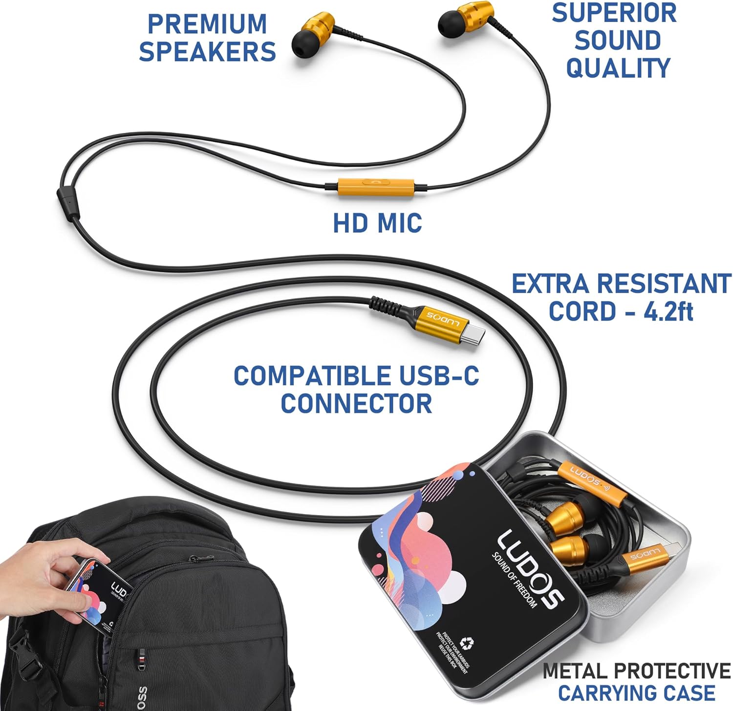 Слушалки LUDOS OMNITONE USB C, 5 години гаранция за iPhone 16 15 Pro Max Plus Samsung Galaxy S24 S23 Ultra S22 S21 FE S20 A53 A54, USB Type C слушалки с микрофон за поставяне в ушите с кабел за iPad