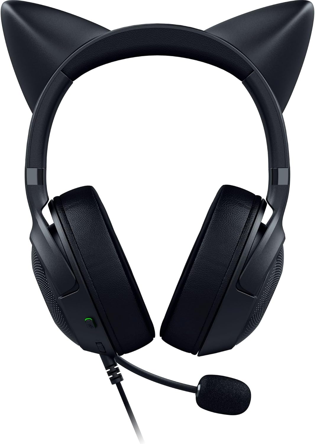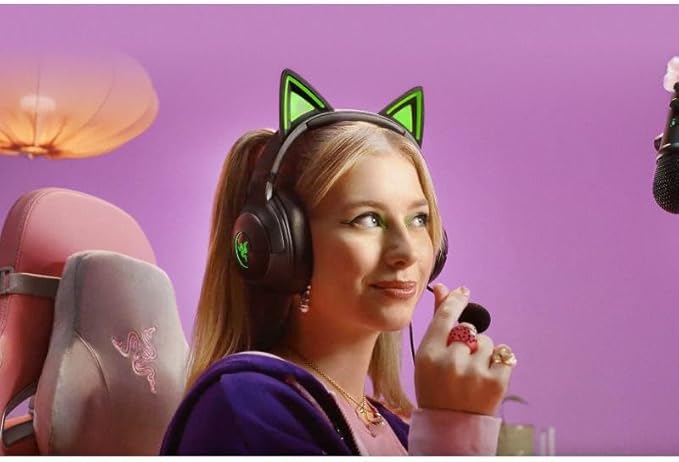Слушалки Razer Kraken Kitty V2 с кабел RGB и котешки уши (реактивно стрийминг осветление, HyperClear Micro, Triforce 40 мм драйвер, 7.1 съраунд звук) черни