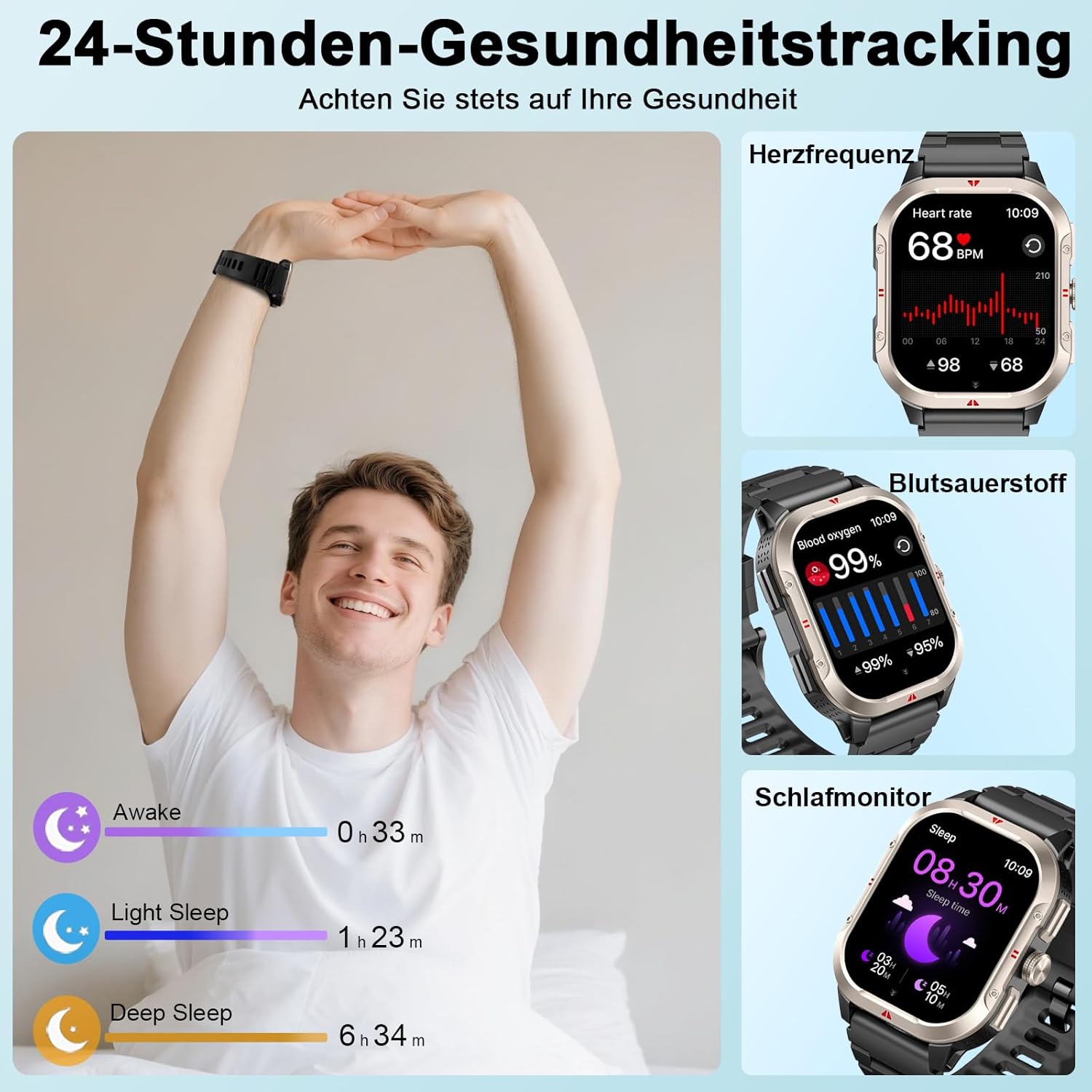 • 24/7 МОНИТОРИНГ НА ЗДРАВЕТО Този спортен смарт часовник за жени и мъже е оборудван с високопрецизен оптичен сензор, който позволява 24-часово наблюдение на сърдечната честота, измерване на сатурацията на кръвта с кислород (SpO2) и подробен анализ на съня ви. Всички събрани здравни данни могат да бъдат синхронизирани и показани в приложението, за да можете по-добре да разберете физическото си състояние.