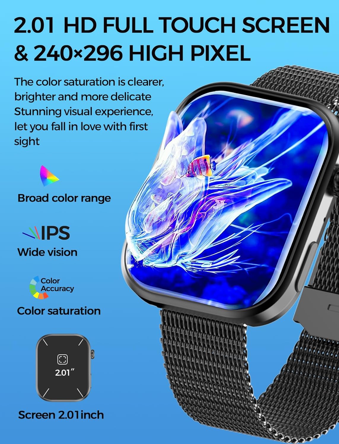 Смарт часовник KipTumtek, 2.01" IPS, Bluetooth, Известия, Крачкомер, Сън тракер, Пулс, SpO2, IP68, 110 спорта, Черен