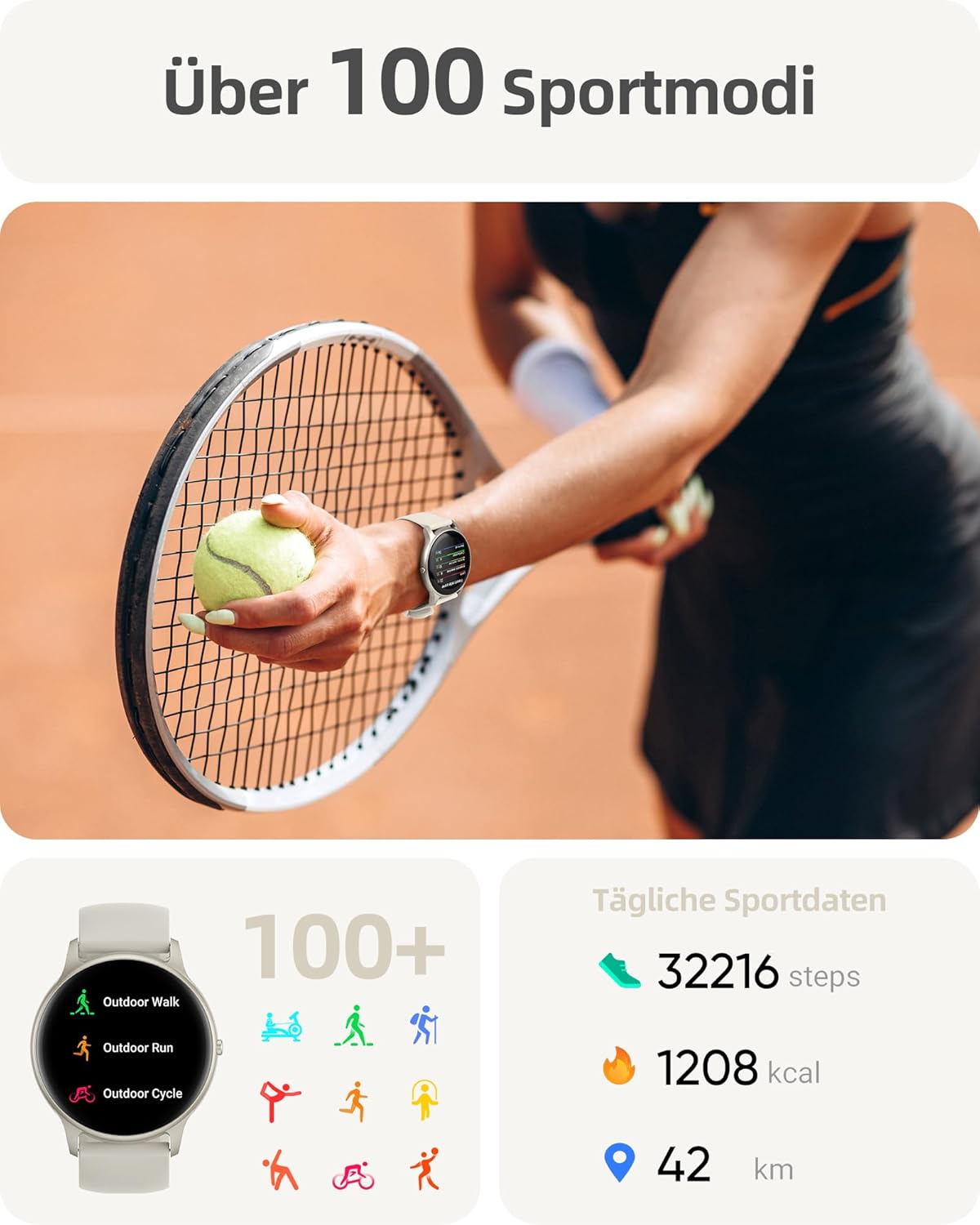 • 100+ спортни режима и водоустойчивост IP68: дамският фитнес часовник предлага над 100 спортни режима, включително 10 предварително инсталирани и 6 персонализирани. Поддържа бягане, колоездене, скачане, йога, футбол, баскетбол, туризъм и други дейности. Точно записва стъпки, пулс, калории и разстояние. Създава здравни отчети и помага за постигане на фитнес цели. Водоустойчивост IP68 за потни, дъждовни или миене на ръце. Не е подходящ за плуване или среда с водна пара.