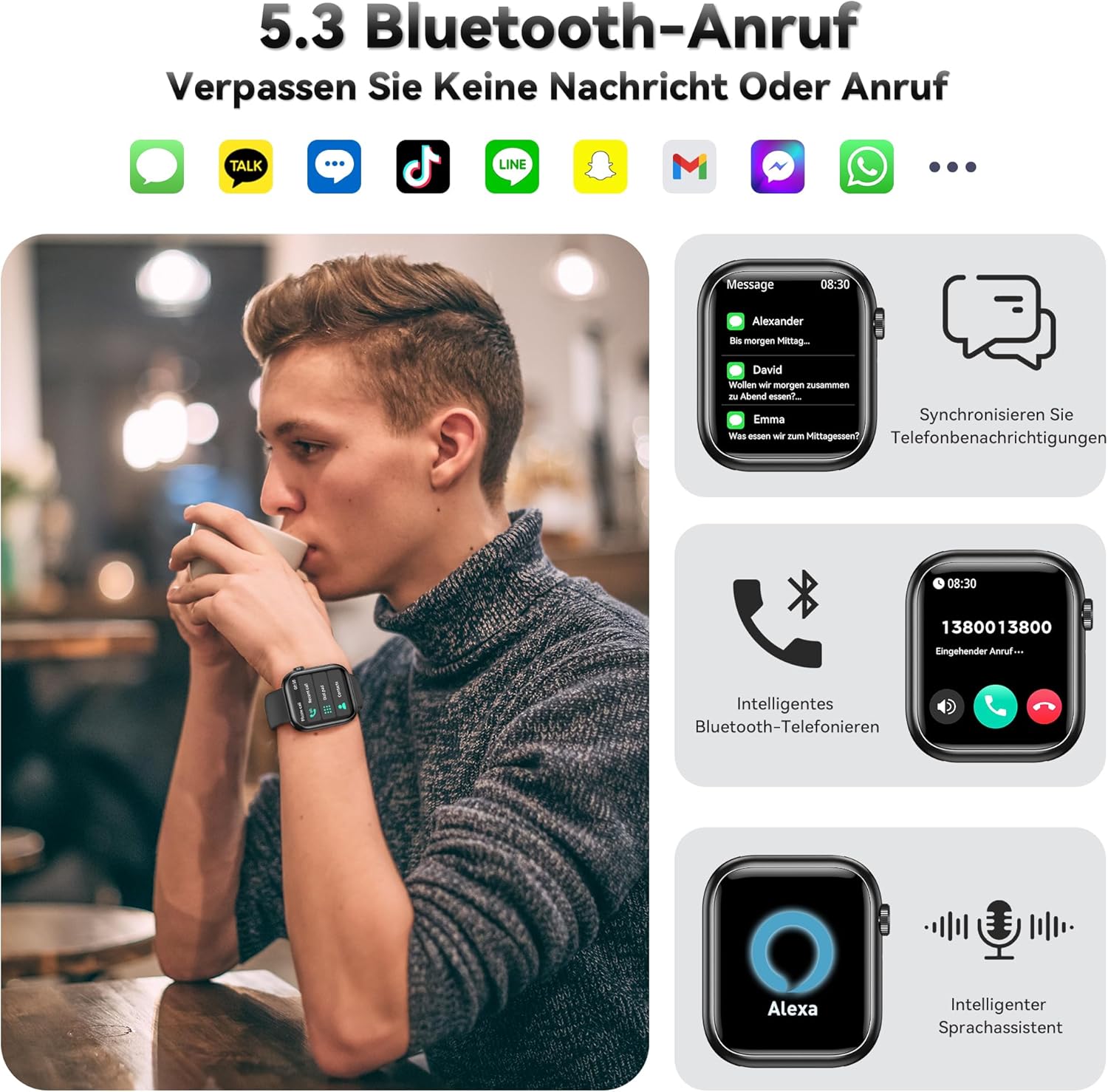 • Bluetooth телефония и известия: След Bluetooth връзка можете да отговаряте или да осъществявате повиквания директно чрез смарт часовника - идеално за в движение, по време на спорт или в офиса. Освен това, часовникът ви информира в реално време за съобщения от WhatsApp, Facebook, Instagram и др. Така че винаги можете да сте в крак с времето, без постоянно да гледате смартфона си.