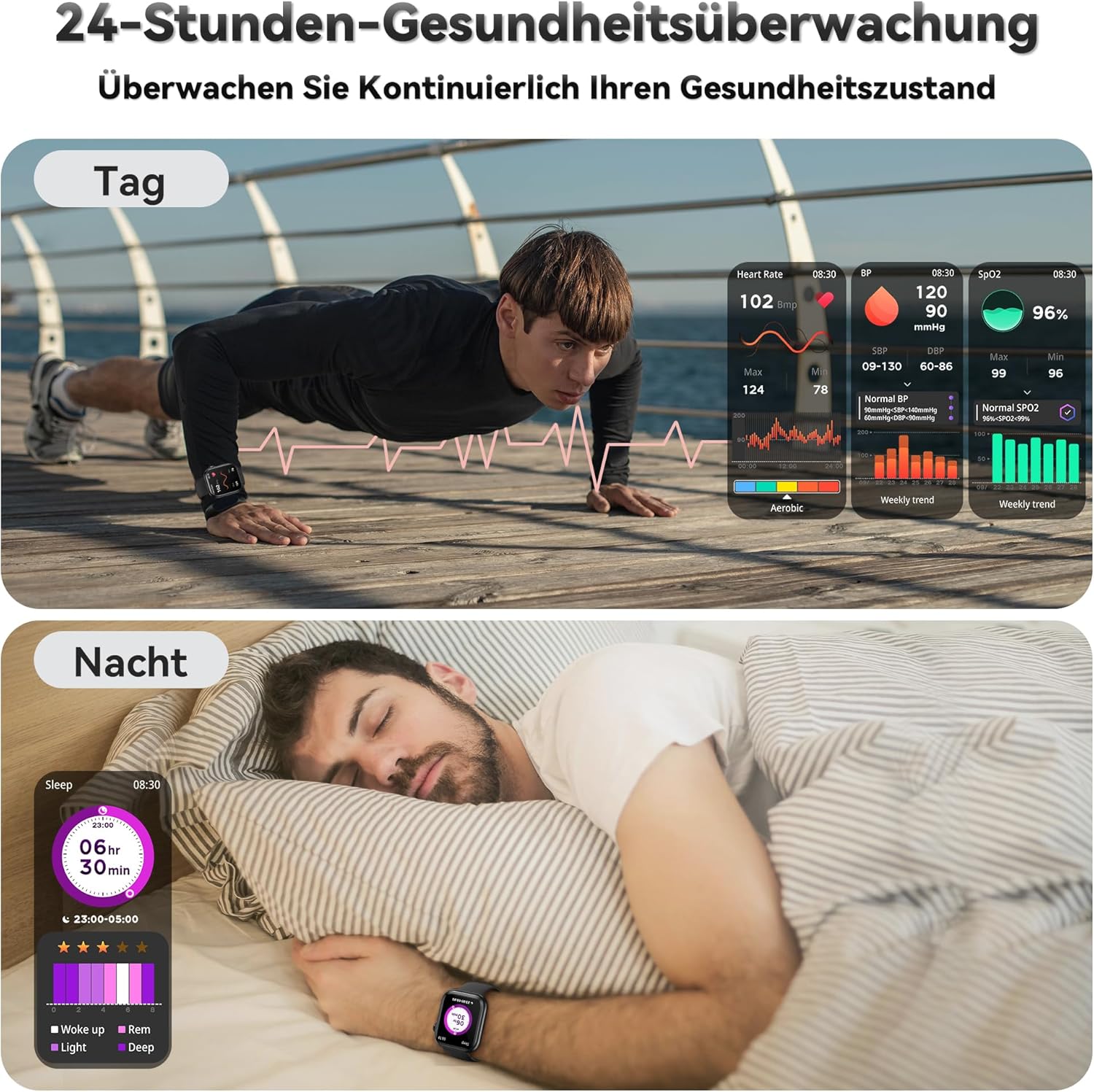 • 24-часово проследяване на здравето и съня в реално време: смарт часовникът измерва сърдечната честота, съдържанието на кислород в кръвта и кръвното налягане 24/7. Сънят ви се анализира автоматично във фази на дълбок, лек сън и бодърстване. Всички здравни данни са ясно видими в приложението и ви помагат устойчиво да подобрите качеството на съня и благосъстоянието си.