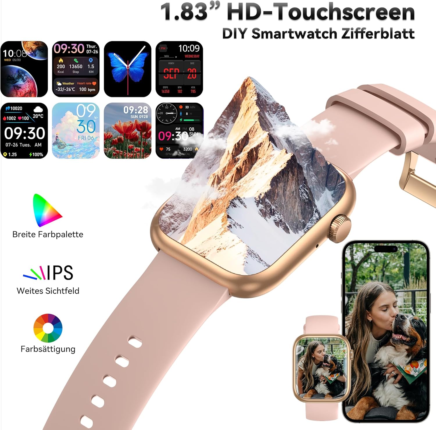 Смарт часовник за жени и мъже 1.83 инча HD сензорен фитнес тракер с функция за телефон/монитор за кръвно налягане/пулсомер/проследяване на сън, крачкомер, 120+ спортни режима, водоустойчив IP68 фитнес часовник