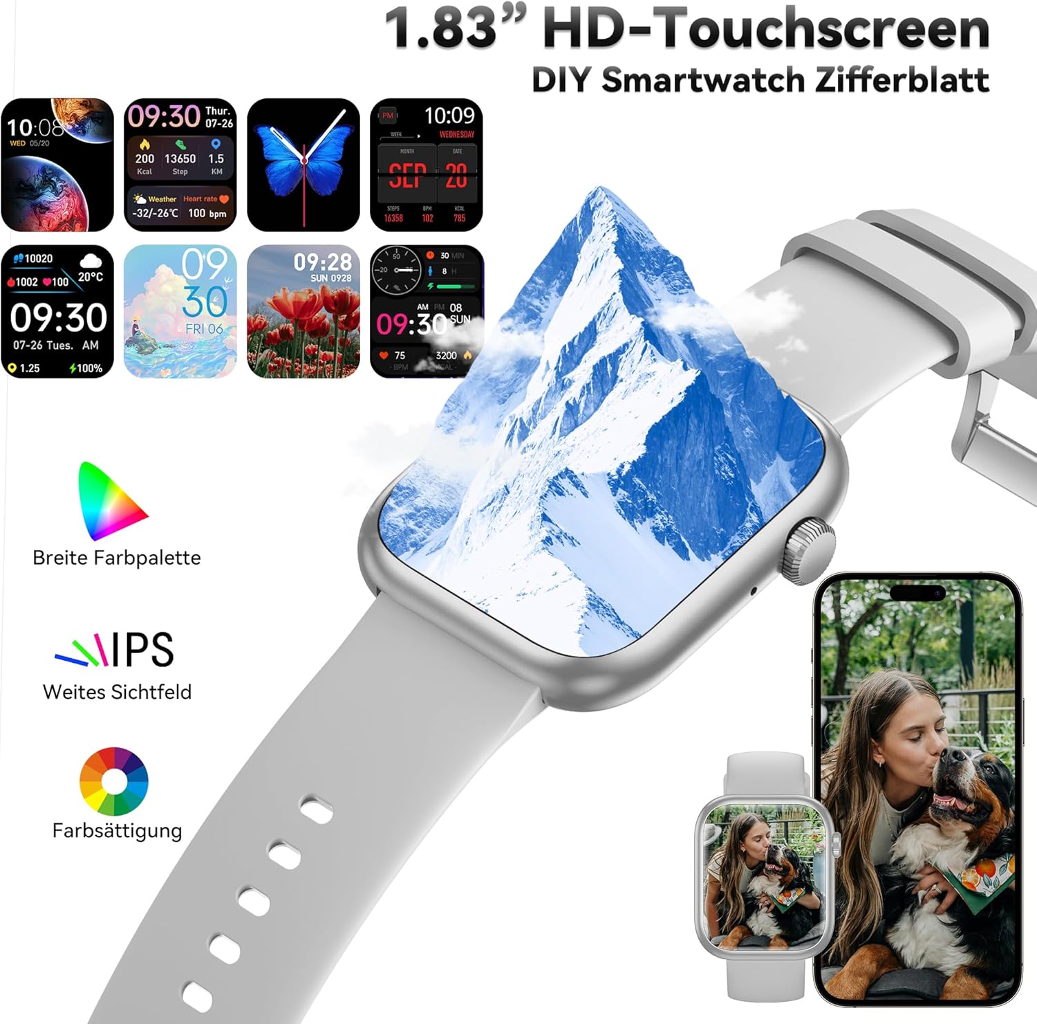 Смарт часовник за жени и мъже 1.83 инча HD сензорен фитнес тракер с функция за телефон/монитор за кръвно налягане/пулсомер/проследяване на сън, крачкомер, 120+ спортни режима, водоустойчив IP68 фитнес часовник