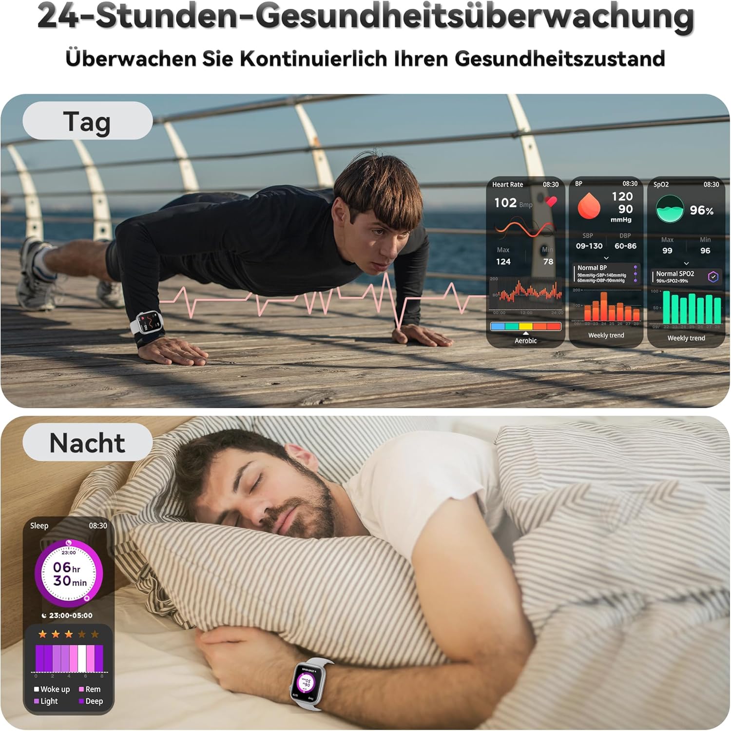 • 24-часово проследяване на здравето и съня в реално време: смарт часовникът измерва сърдечната честота, съдържанието на кислород в кръвта и кръвното налягане 24/7. Сънят ви се анализира автоматично във фази на дълбок, лек сън и бодърстване. Всички здравни данни са ясно видими в приложението и ви помагат устойчиво да подобрите качеството на съня и благосъстоянието си.