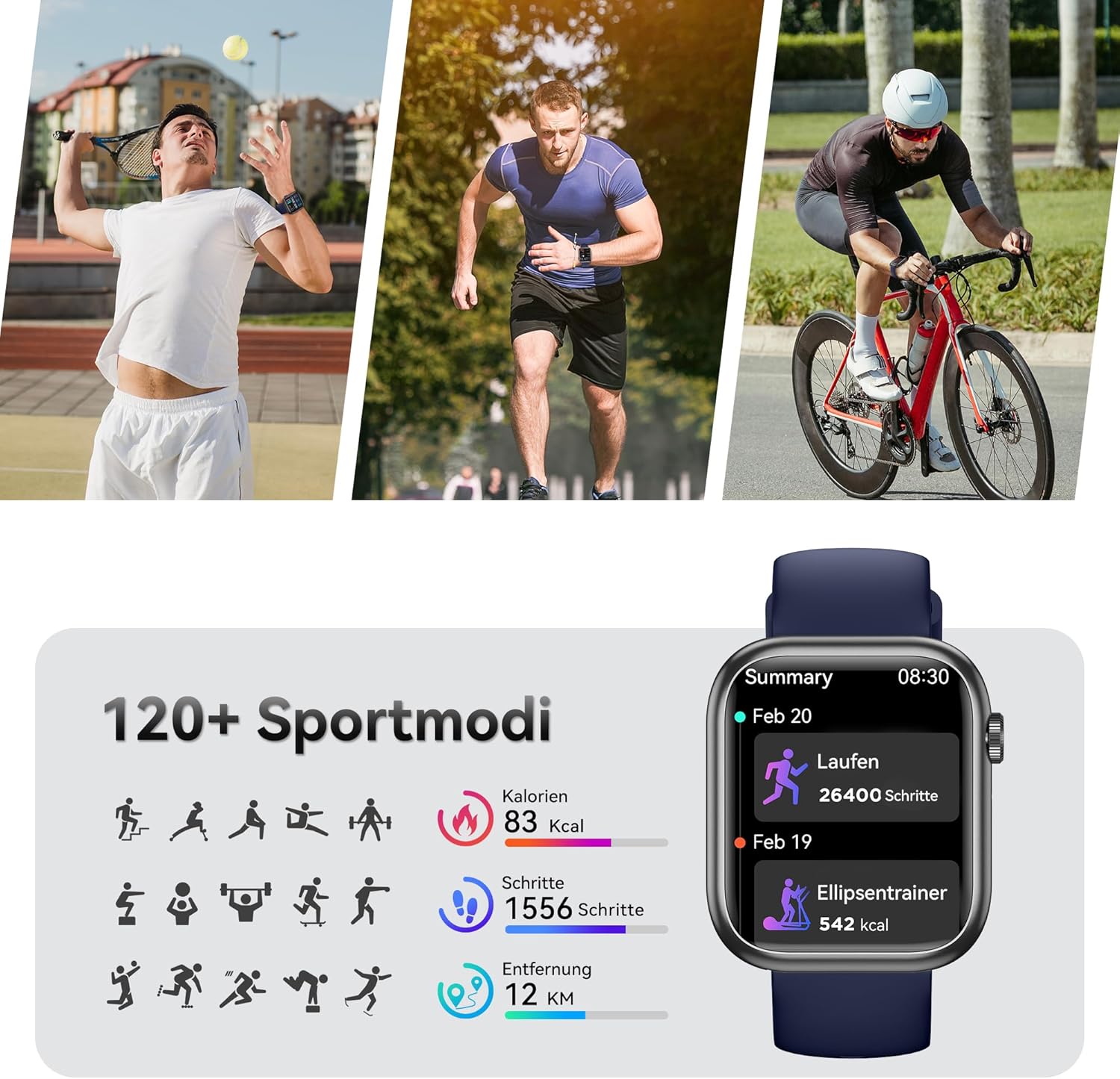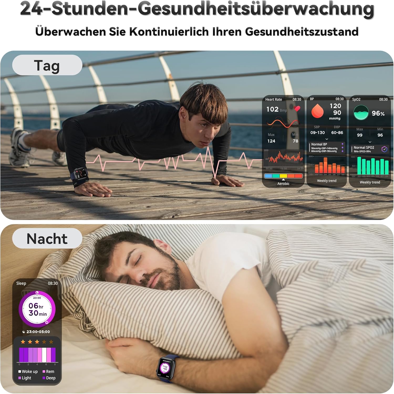 • Bluetooth телефония и известия: След Bluetooth връзка можете да отговаряте или да осъществявате повиквания директно чрез смарт часовника - идеално за в движение, по време на спорт или в офиса. Освен това, часовникът ви информира в реално време за съобщения от WhatsApp, Facebook, Instagram и др. Така че винаги можете да сте в крак с времето, без постоянно да гледате смартфона си.