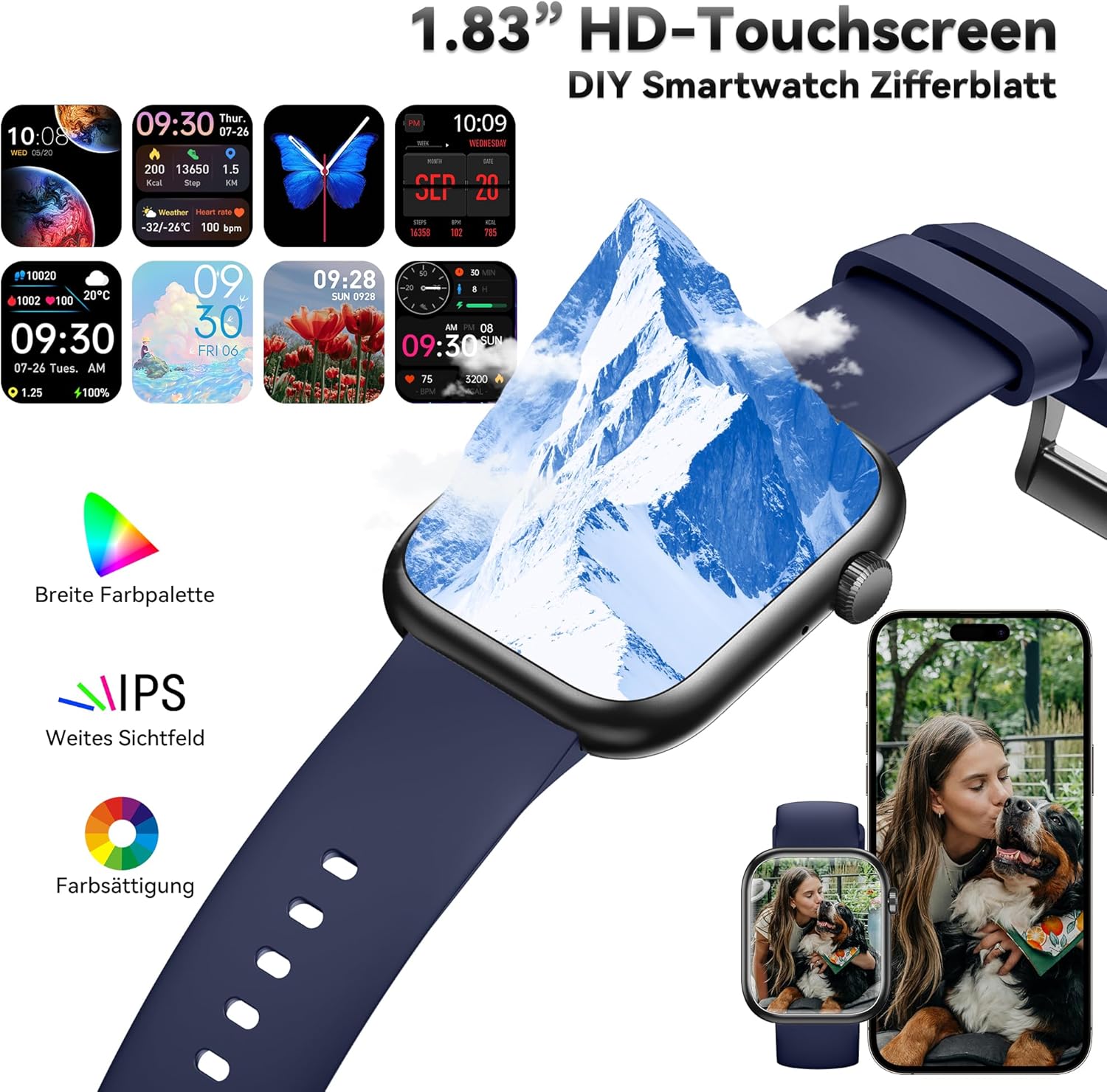 Смарт часовник за жени и мъже 1.83 инча HD сензорен фитнес тракер с функция за телефон/монитор за кръвно налягане/пулсомер/проследяване на сън, крачкомер, 120+ спортни режима, водоустойчив IP68 фитнес часовник