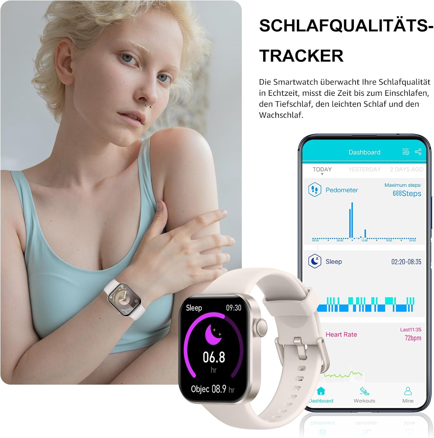• Целодневно проследяване на здравето: вграденият високопрецизен PPG сензор следи сърдечната ви честота 24/7. Той също така анализира съня ви (будност, лек и дълбок сън) и създава отчет за качеството на съня, за да можете по-добре да разберете физическото си състояние.
