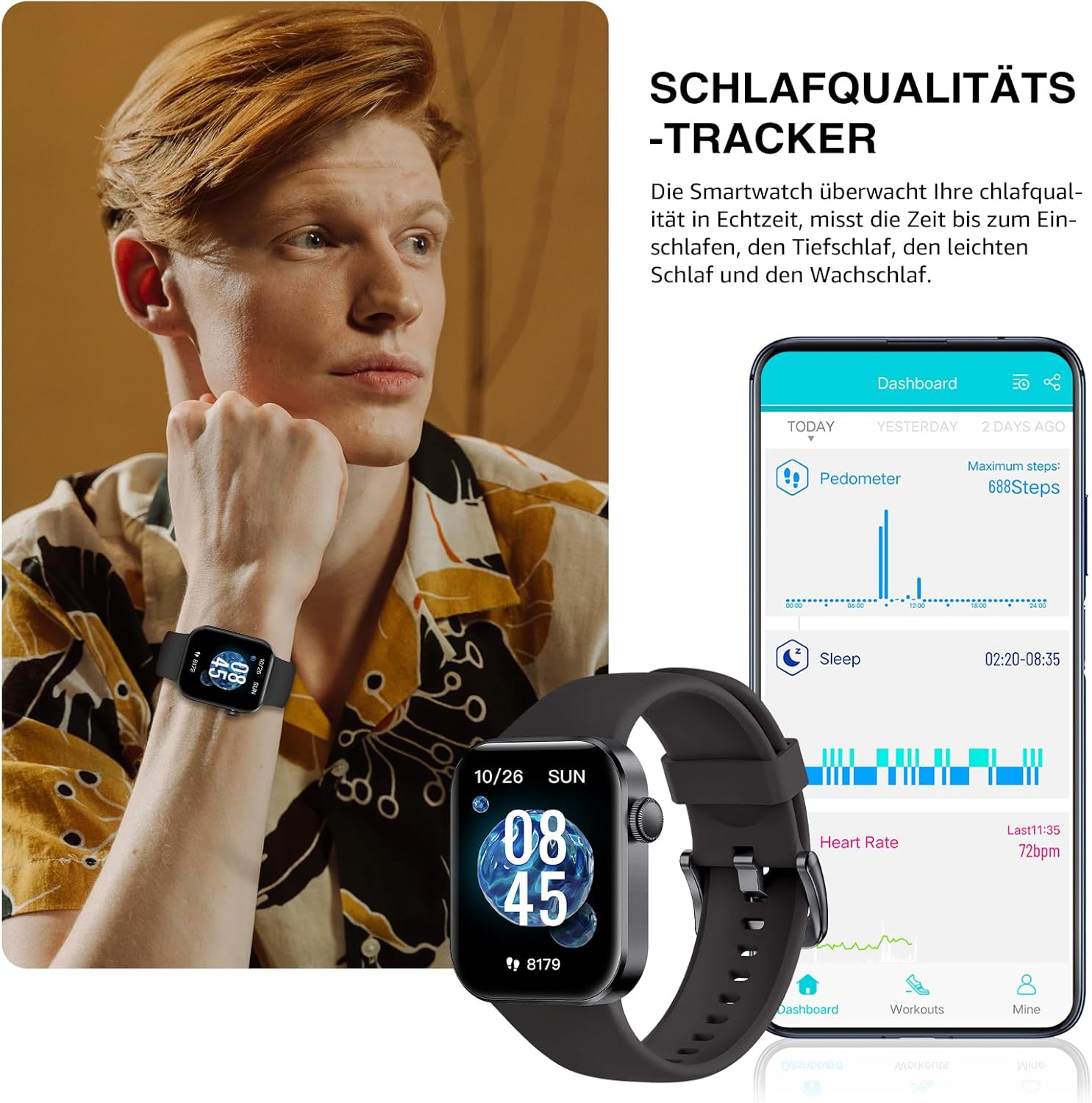 • Целодневно проследяване на здравето: вграденият високопрецизен PPG сензор следи сърдечната ви честота 24/7. Той също така анализира съня ви (будност, лек и дълбок сън) и създава отчет за качеството на съня, за да можете по-добре да разберете физическото си състояние.