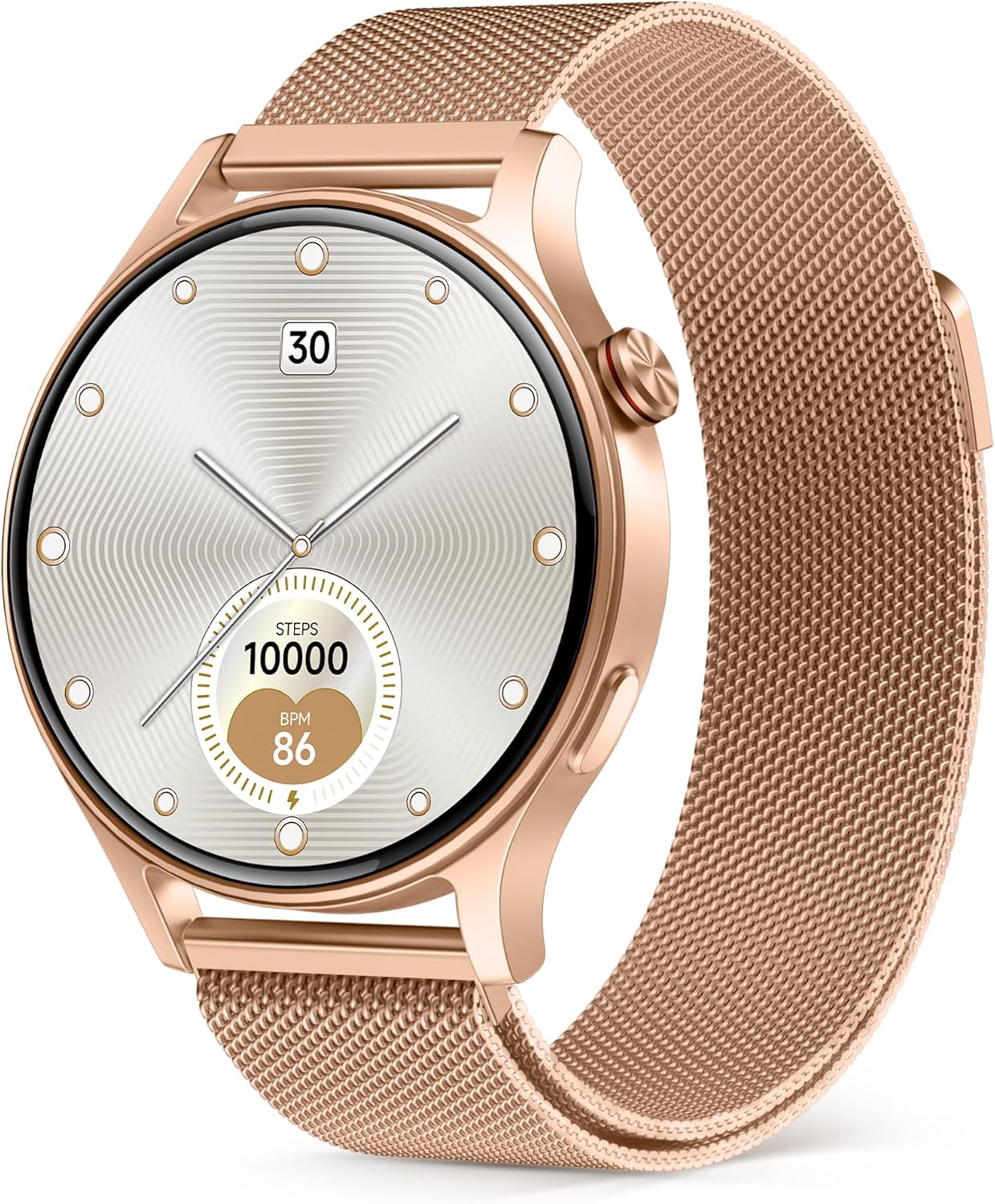• Стилен дизайн за жени: с 1,32-инчов AOMLED екран и метални ръбове, смарт часовникът ви предлага ясно и ярко цветопредаване и отлично потребителско изживяване, особено за жени и мъже, които са приоритет за модата и фитнеса. Съвети: размерът на екрана на часовника е около 33 мм (1,32 инча), а размерът с метална рамка е 43 мм (1,69 инча). Общото тегло на часовника е приблизително 50,64 г.